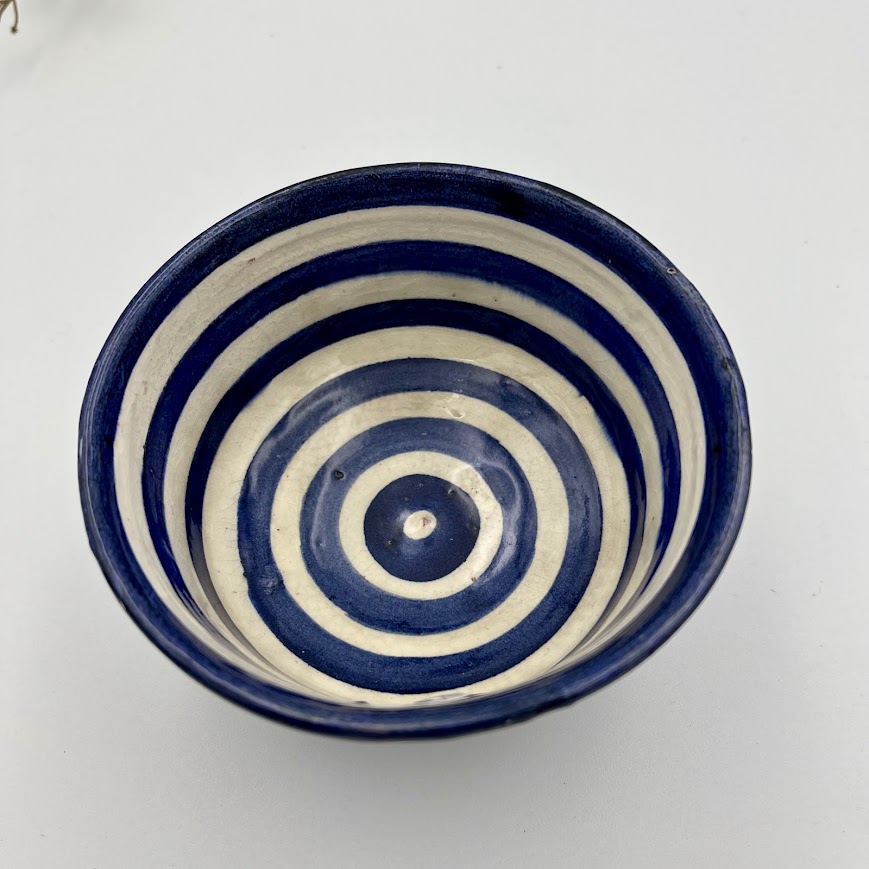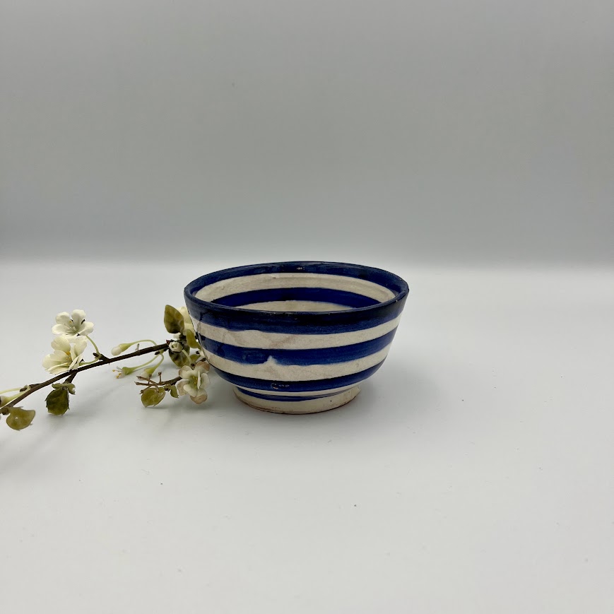Lille stribet keramikskål i blå/hvid – enkel og charmerende.