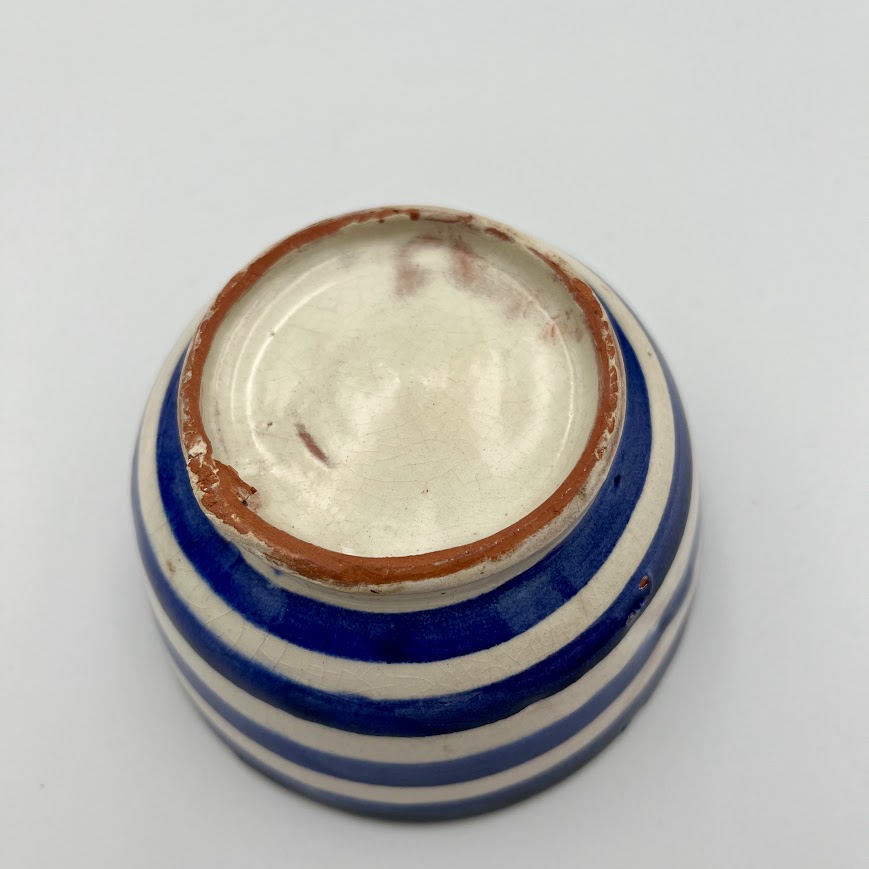 Fin lille keramikskål med klassiske blå og hvide striber.
