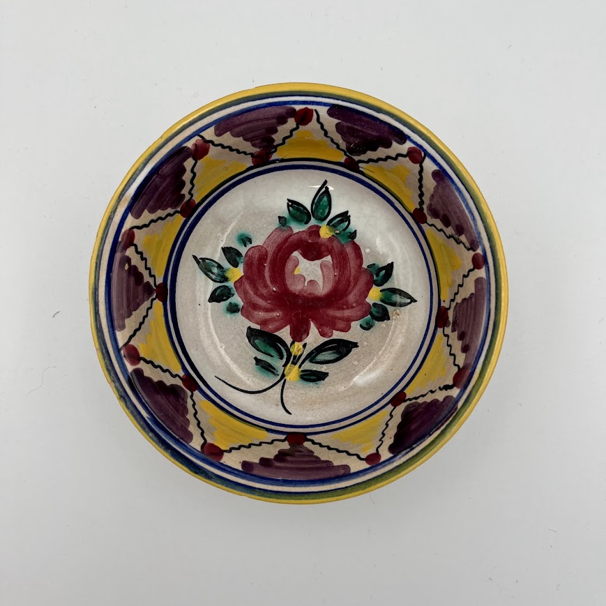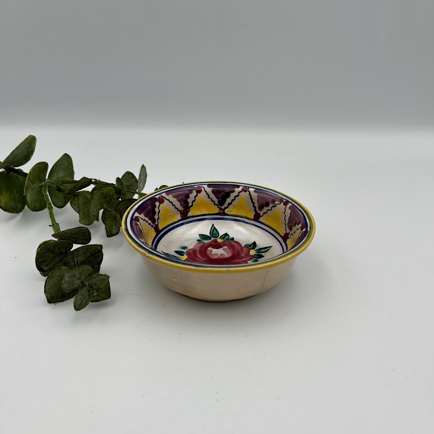 Lille dekorativ skål i keramik med smukt håndmalet mønster i klare farver.