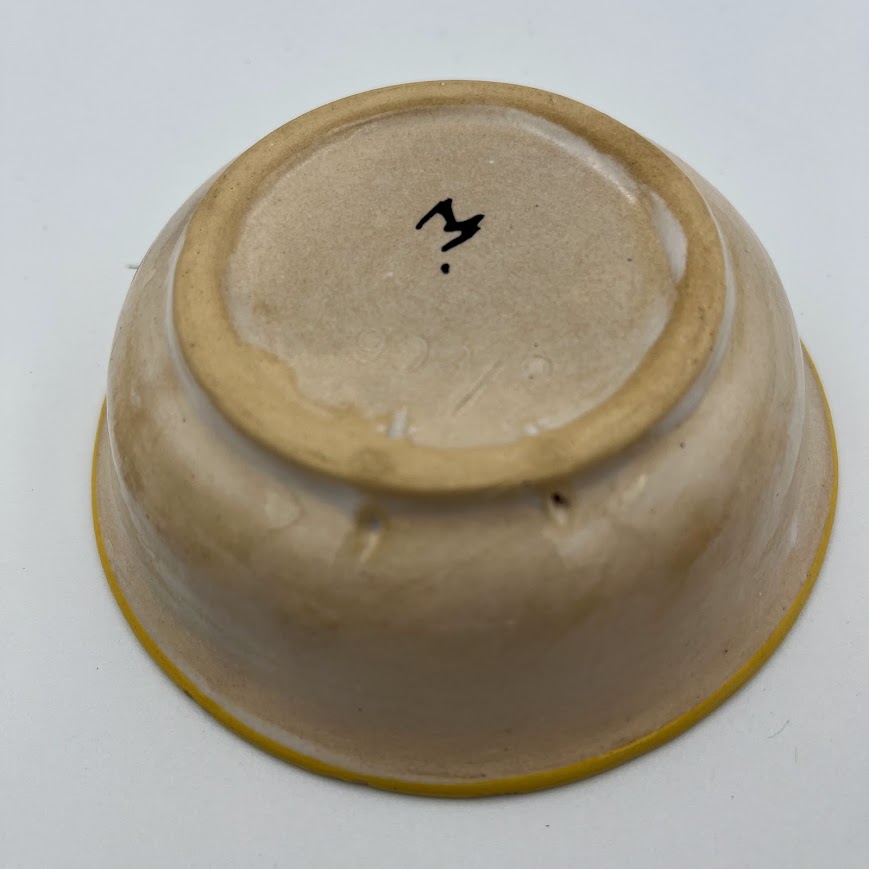 Skålen har et charmerende udtryk med blomster i midten og geometriske detaljer langs kanten i gule, lilla og blå nuancer.
