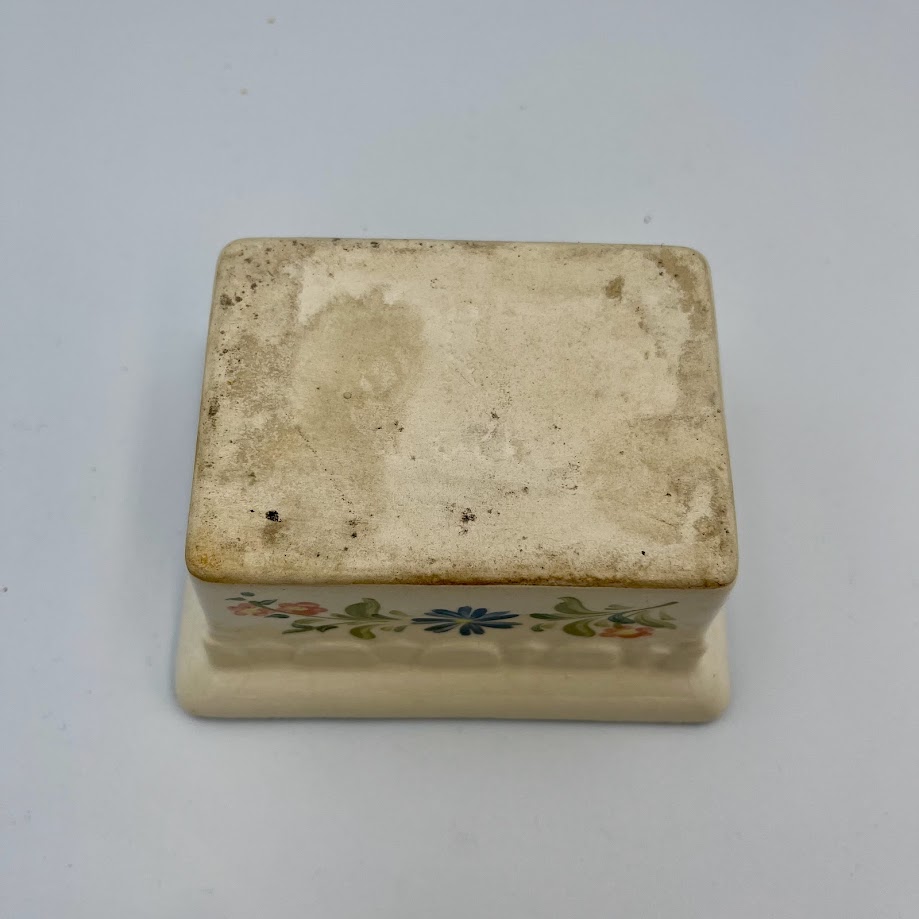 Fransk inspireret keramikskål med låg og blomsterdekor. Med brugsspor – hyggelig og dekorativ.