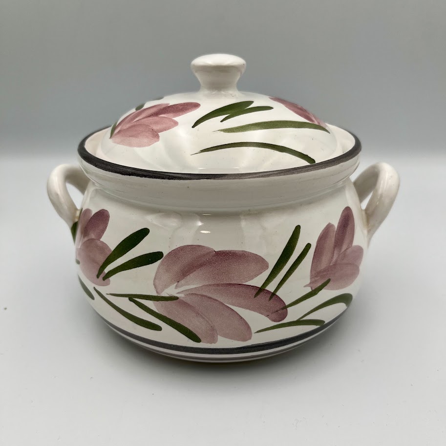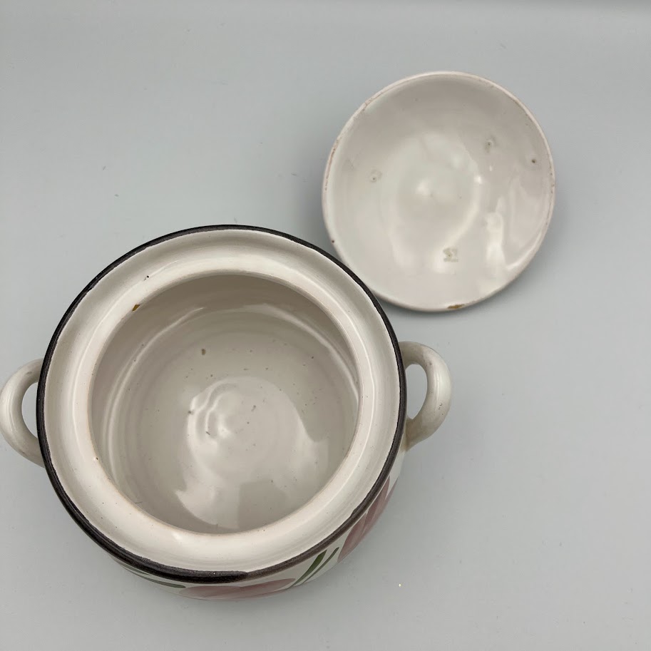 Blomstret keramik krukke med låg og hanke – velegnet som sukkerskål eller opbevaring.