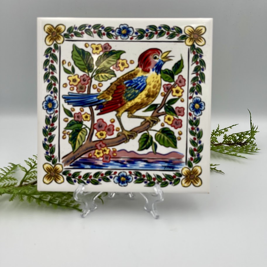 Flisen er udført i klare, livlige farver med en smuk dekorativ bort langs kanten.
