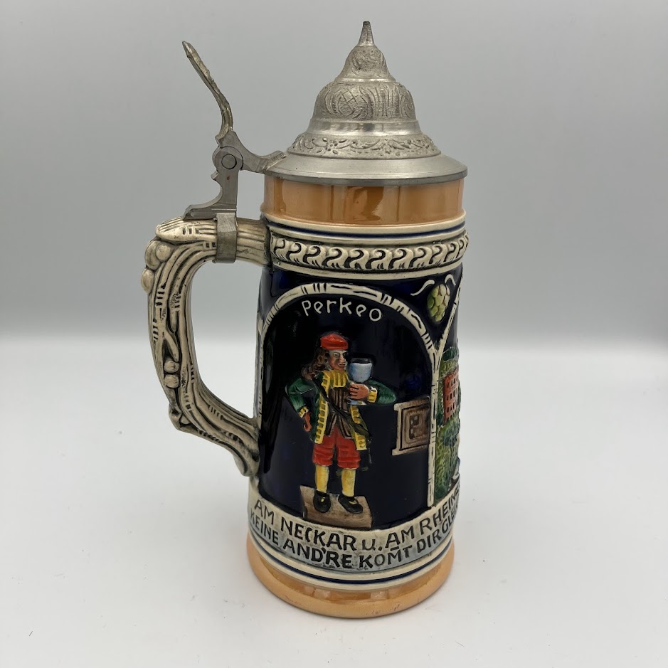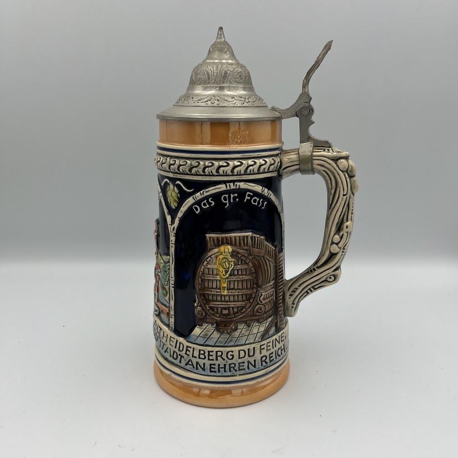 Tysk ølkrus med låg – klassisk og dekorativt samlerobjekt.