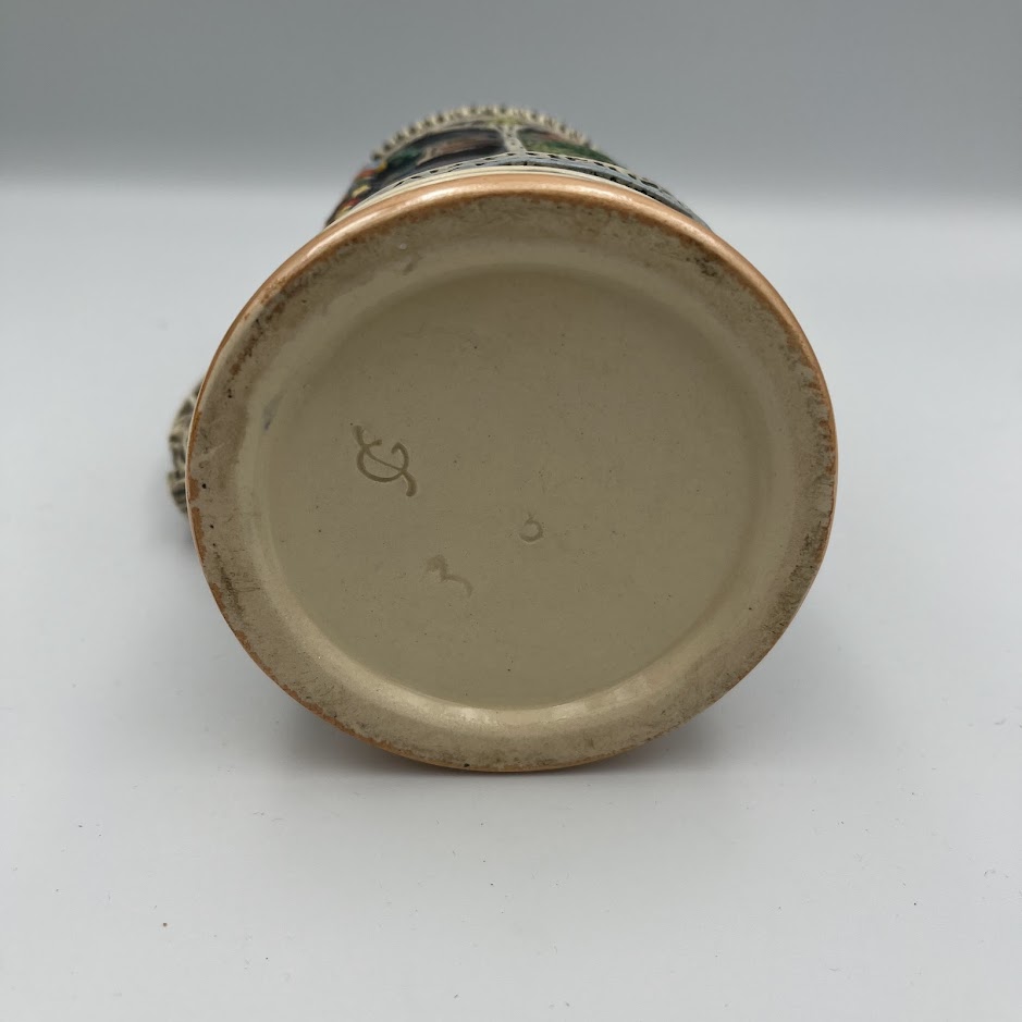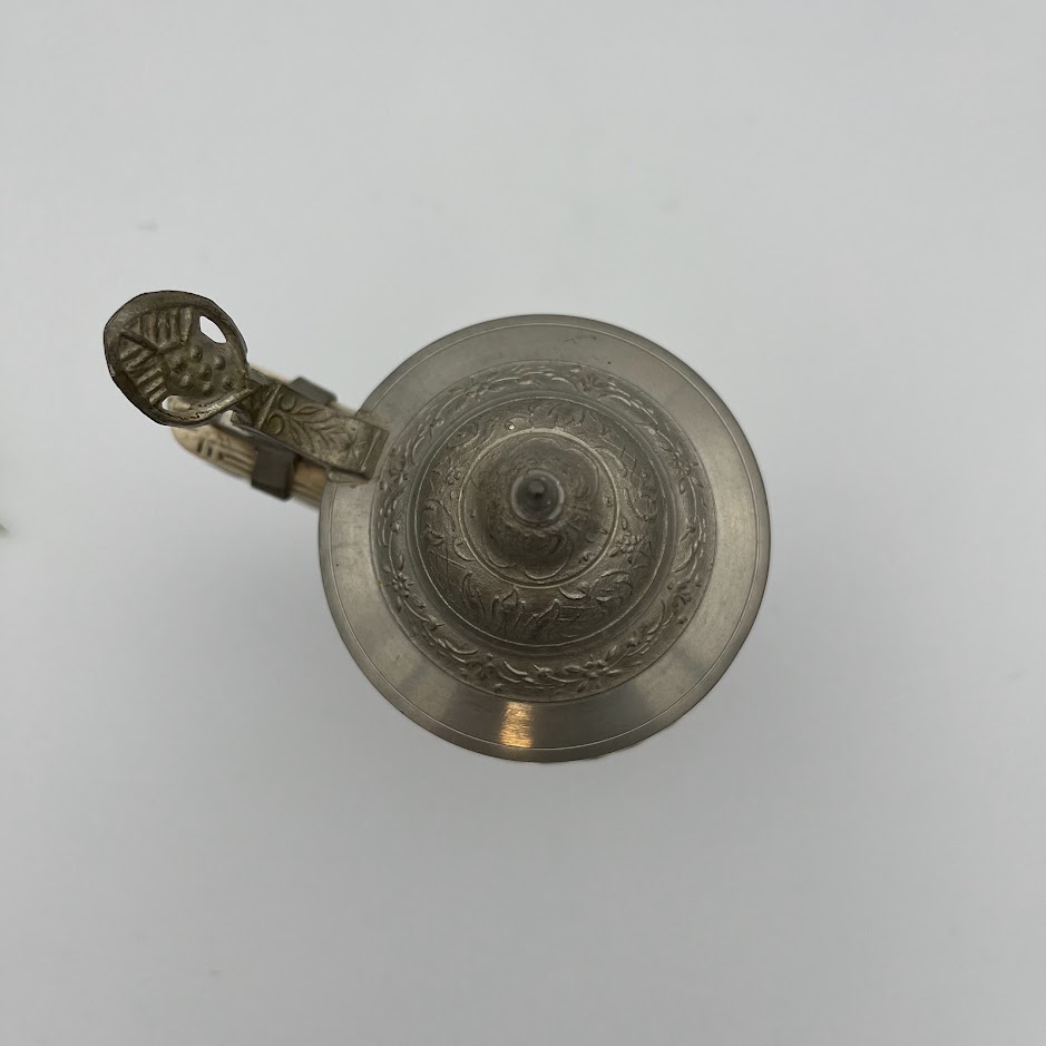 Flot og detaljeret tysk ølkrus i keramik med låg i tin.