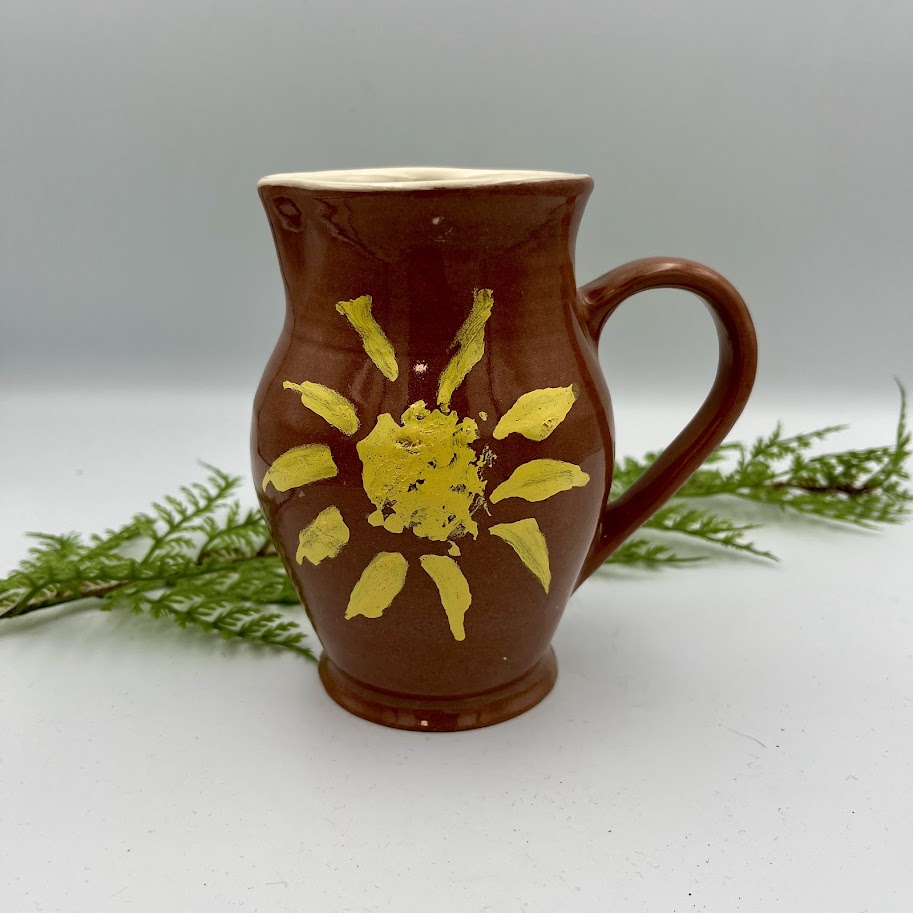 Charmerende keramikkande i varm brun glasur med håndmalet, gul sol på fronten.
