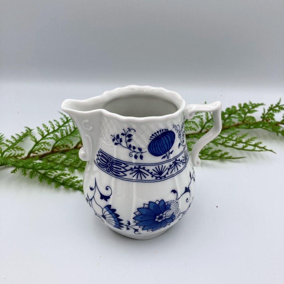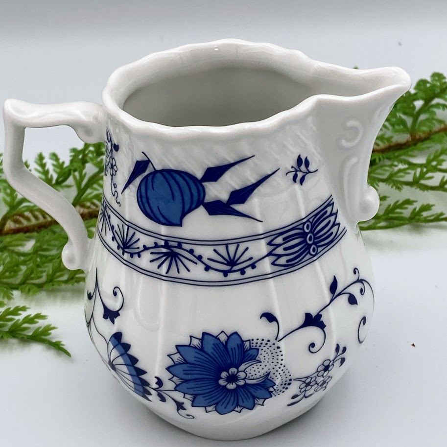 Fin porcelænskande i klassisk blå og hvid dekoration med blomster- og mønstermotiv. Kanden har en flot form med lille hældetud og dekorativ hank.