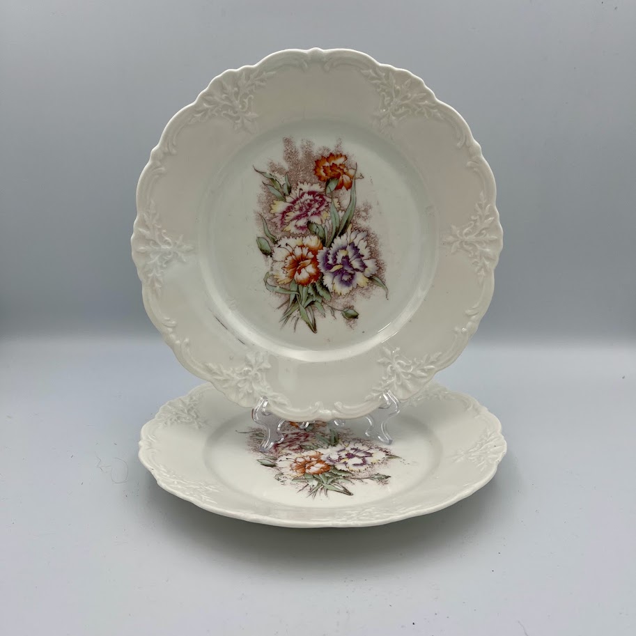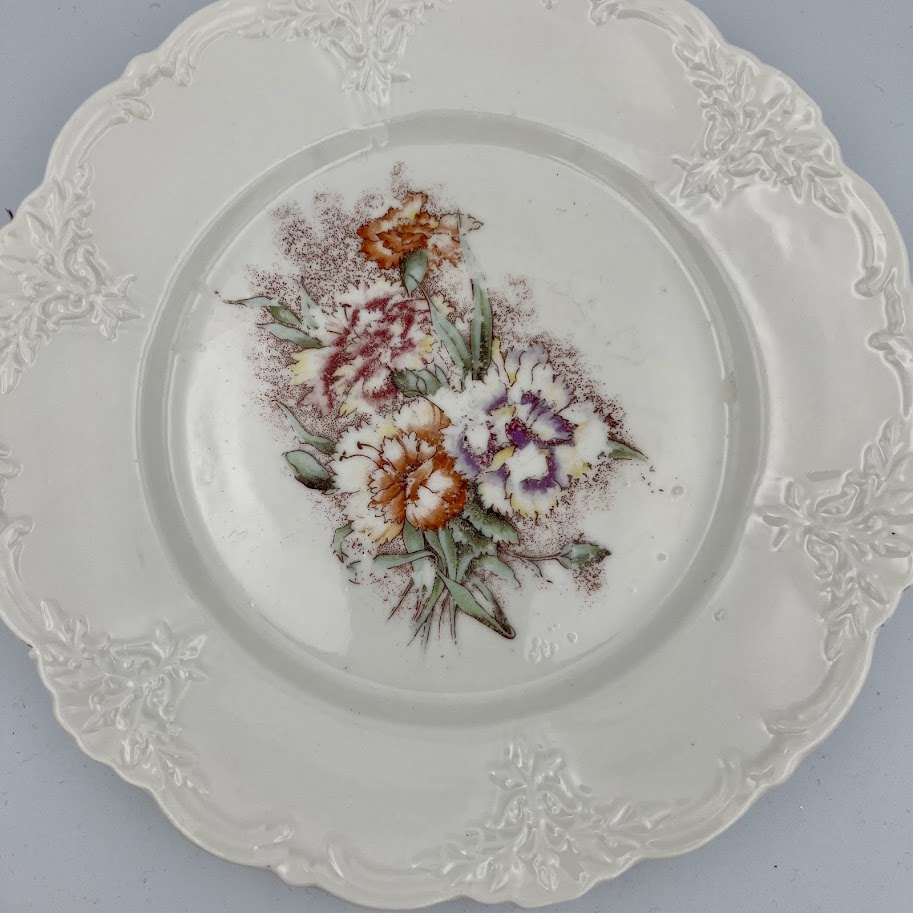 Cremefarvet porcelænstallerken med reliefkant og romantisk blomstermotiv i midten. Klassisk og dekorativ stil.