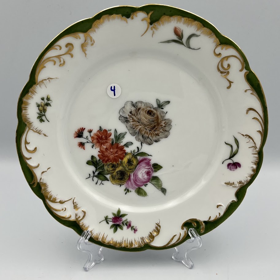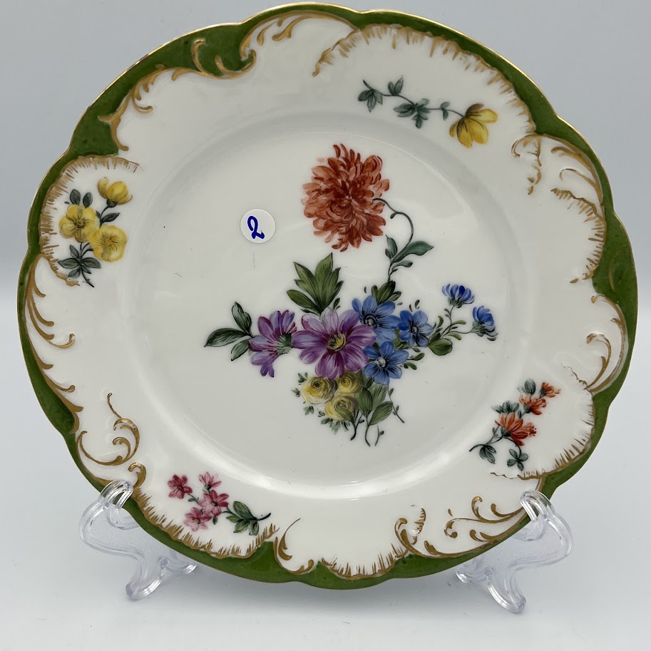 Smuk porcelænstallerken med elegant blomsterdekoration og dekorativ kant i grøn og guld, fra Rosenthal Tyskland.