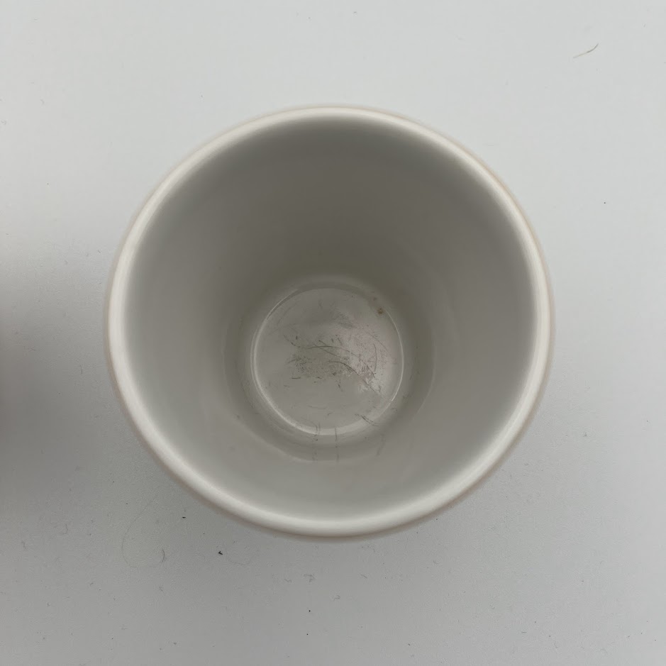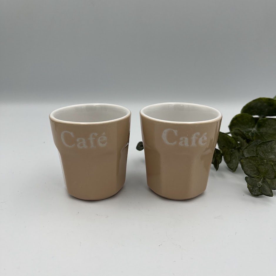Sæt med 2 små kopper i keramik med teksten “Café”. Kopperne har en varm beige farve og et enkelt, hyggeligt design, der passer perfekt til kaffe, espresso eller små serveringer.