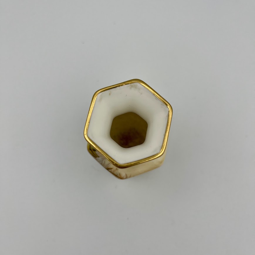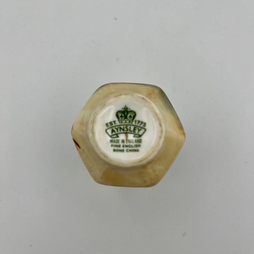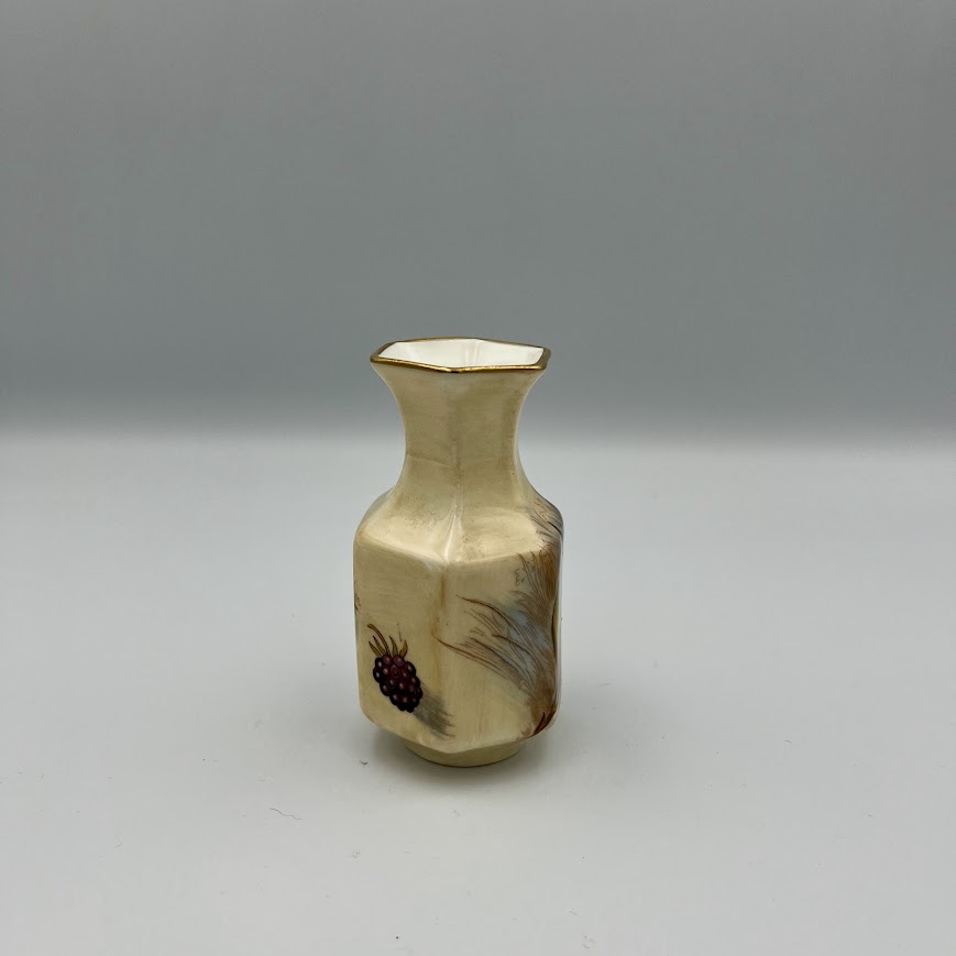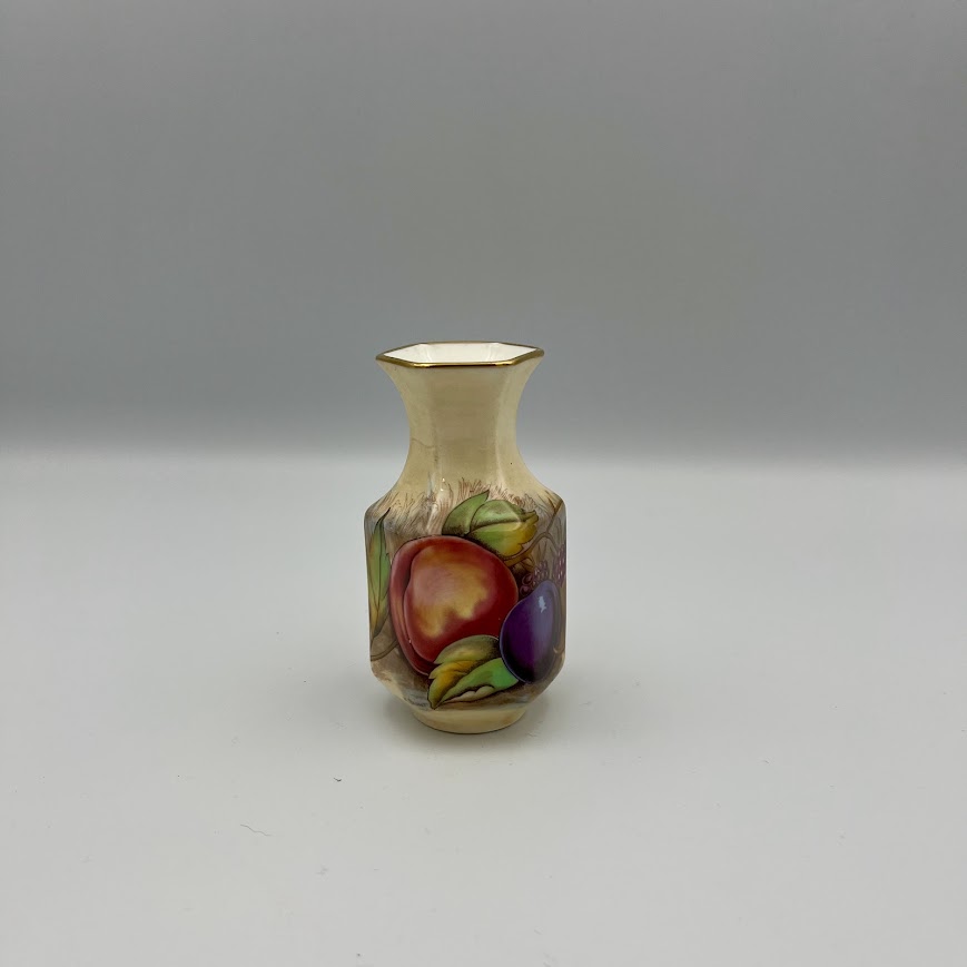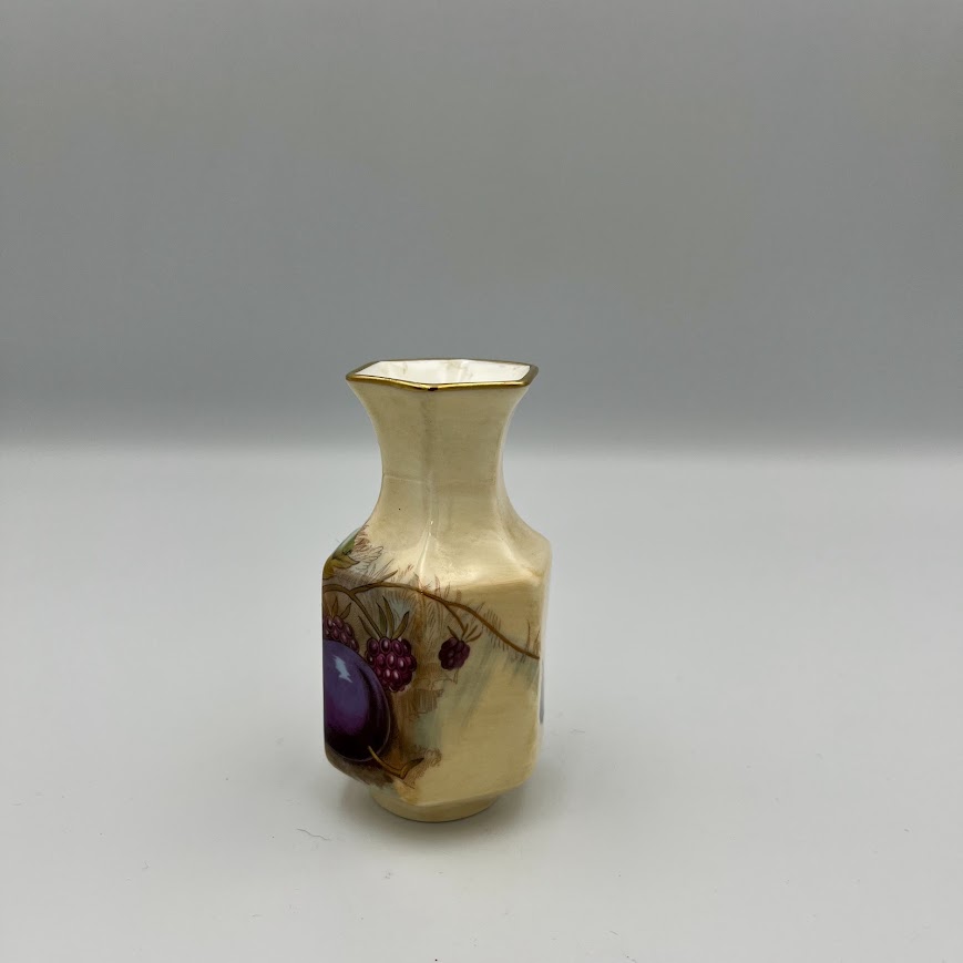 Fin lille knopvase ("Bud vase") vase i porcelæn fra Aynsley Orchard Gold med smukt frugtmotiv.