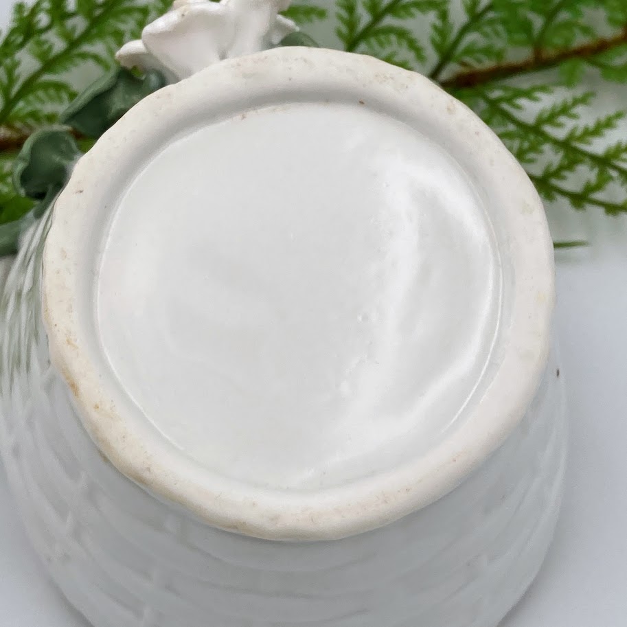 Fin hvid urtepotte / potteskjuler med flettet struktur og to små hanke. Den er dekoreret med grønne blade og lyserøde blomster i relief, som giver et romantisk og hyggeligt udtryk.