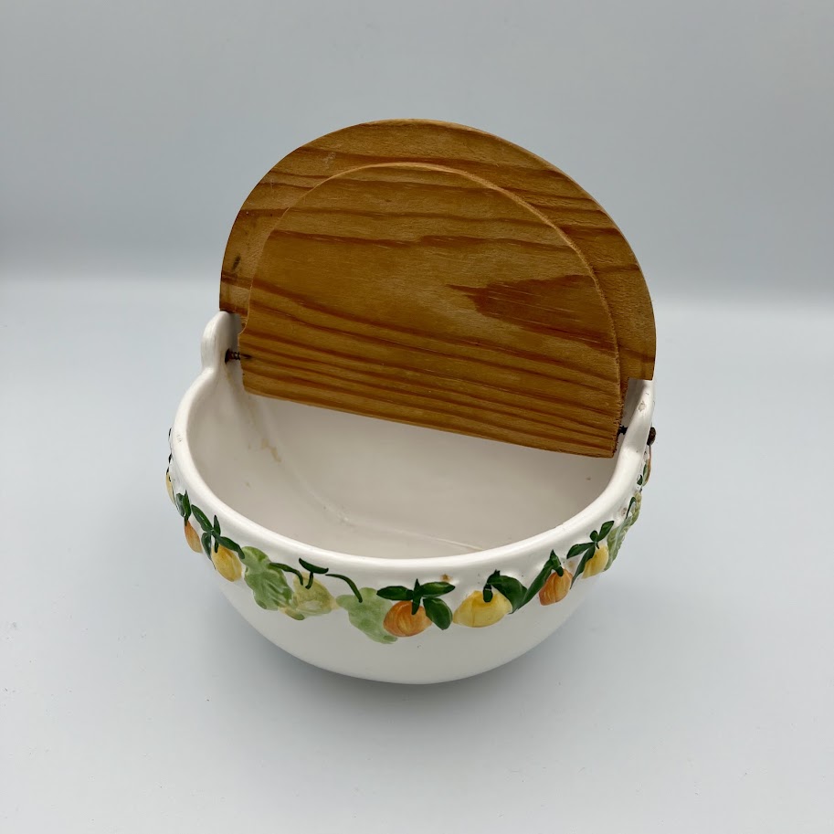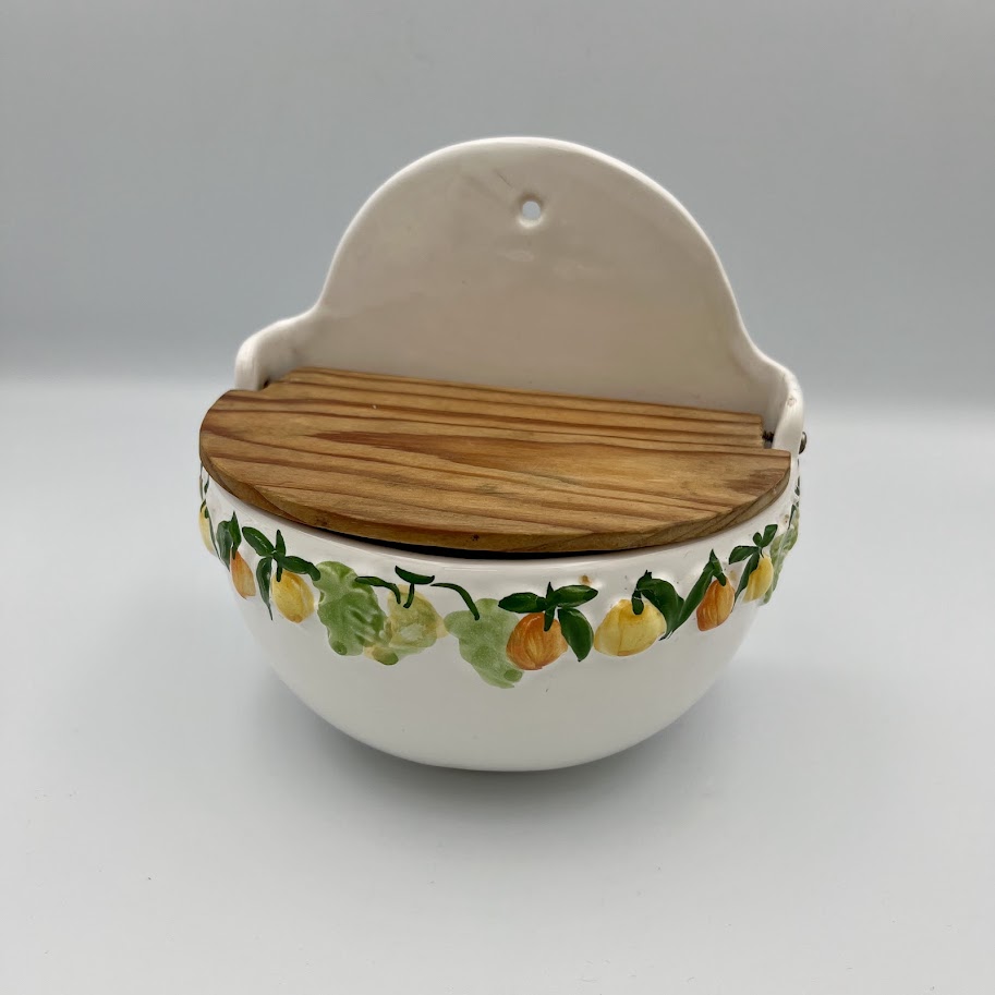 Charmerende væghængt saltkar i keramik med håndmalede citroner og druer samt træklap.
