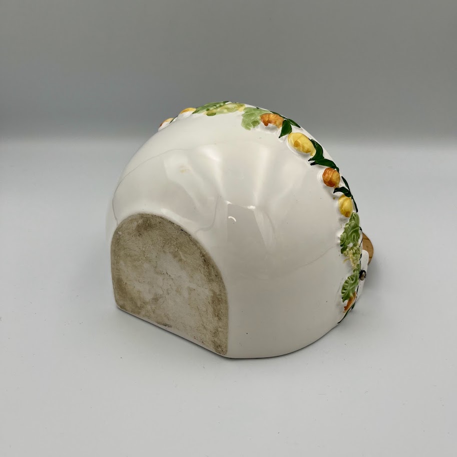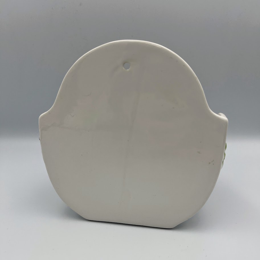 Charmerende væghængt saltkar i keramik med håndmalet frugtdekoration.
