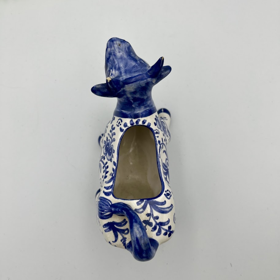 Charmerende flødekande i keramik formet som en ko og dekoreret i klassisk blå og hvid stil.
