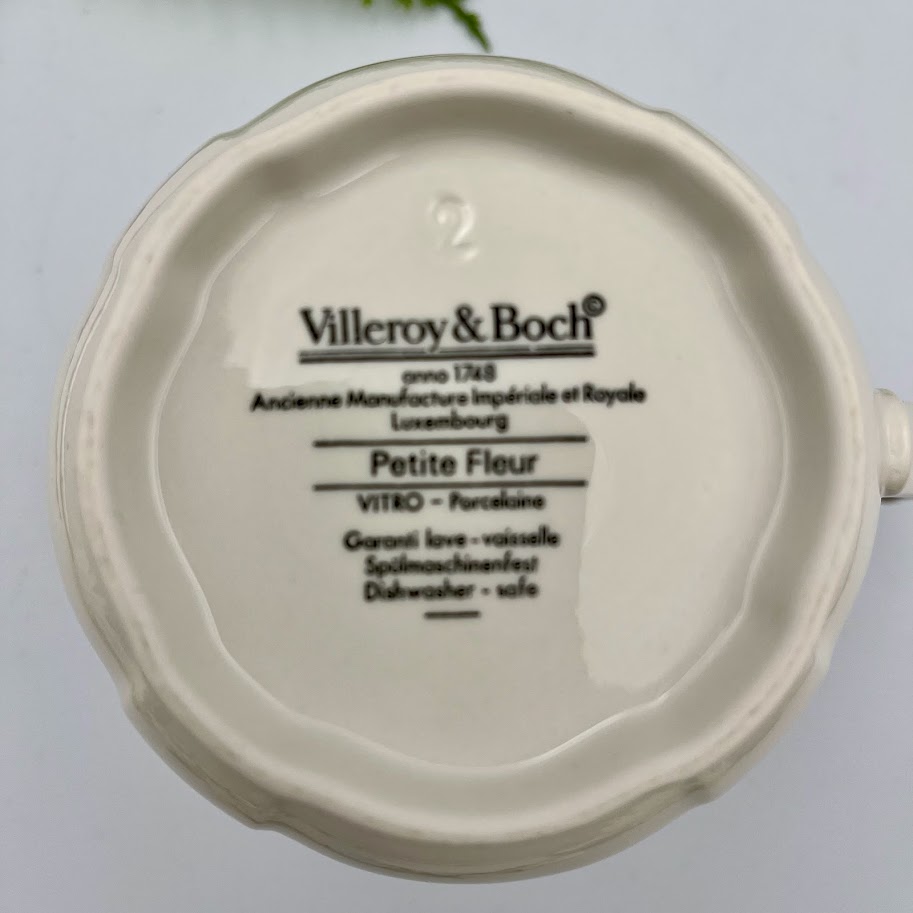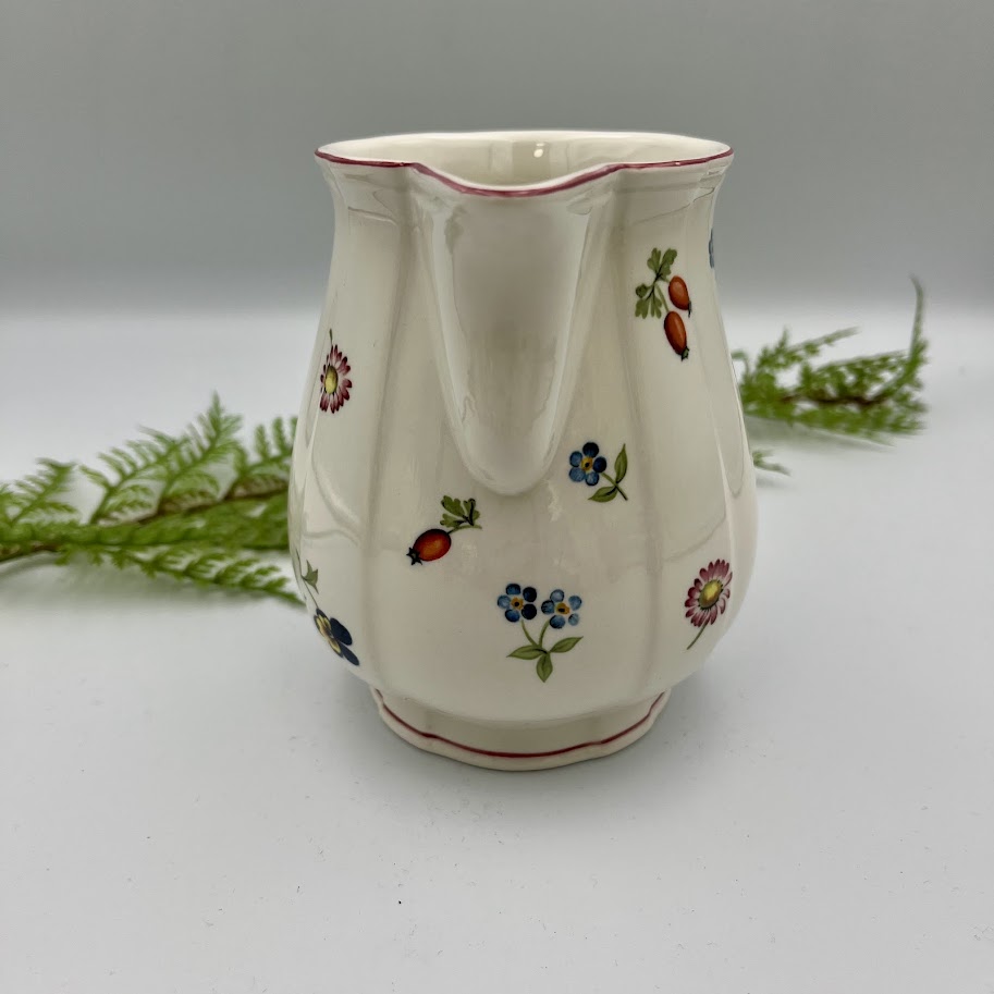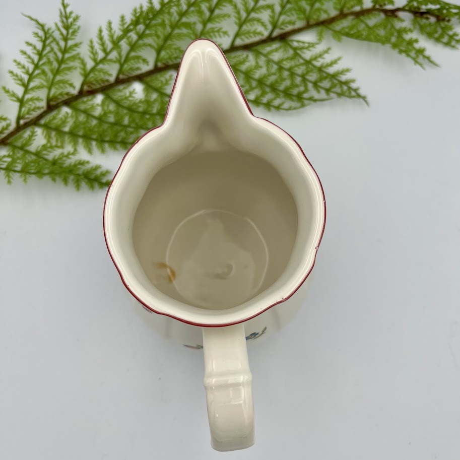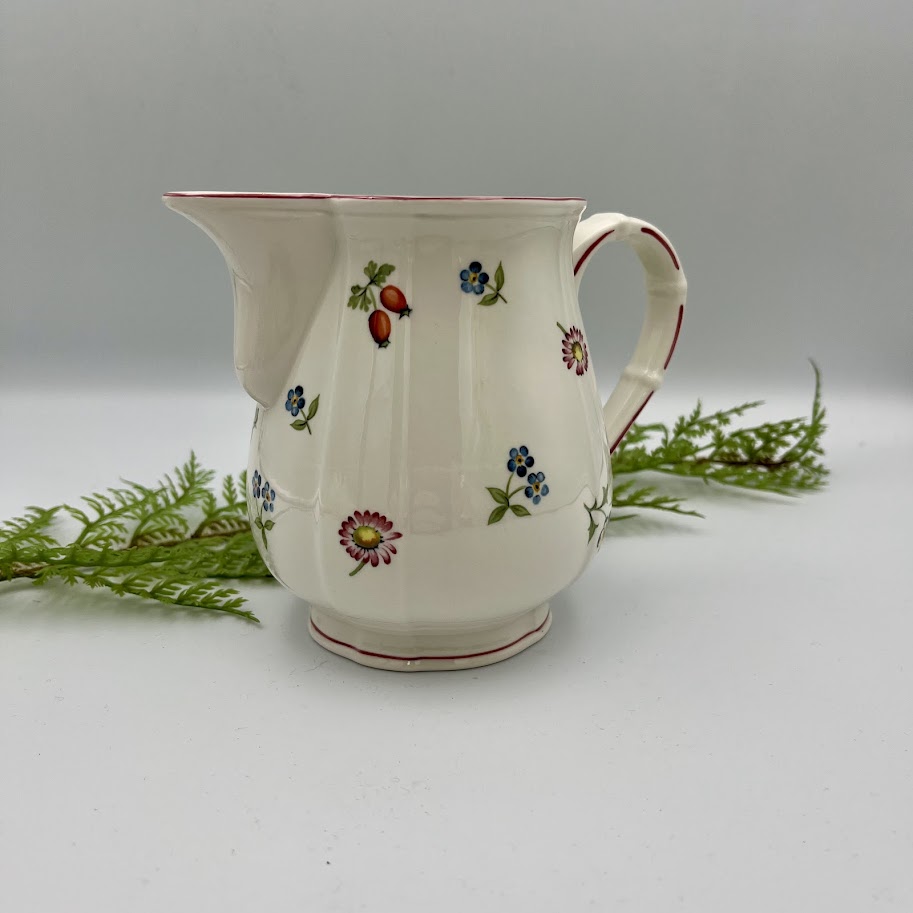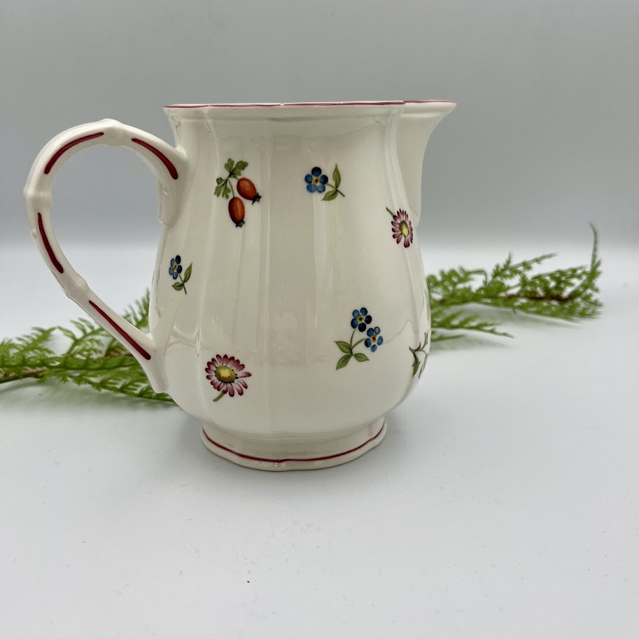 Smuk kande fra Villeroy & Boch i hvid porcelæn med fin, romantisk blomsterdekoration. Kanden er dekoreret med små, farverige blomster og hybenmotiver samt en diskret rød kant langs top og bund, som giver et elegant og klassisk udtryk.