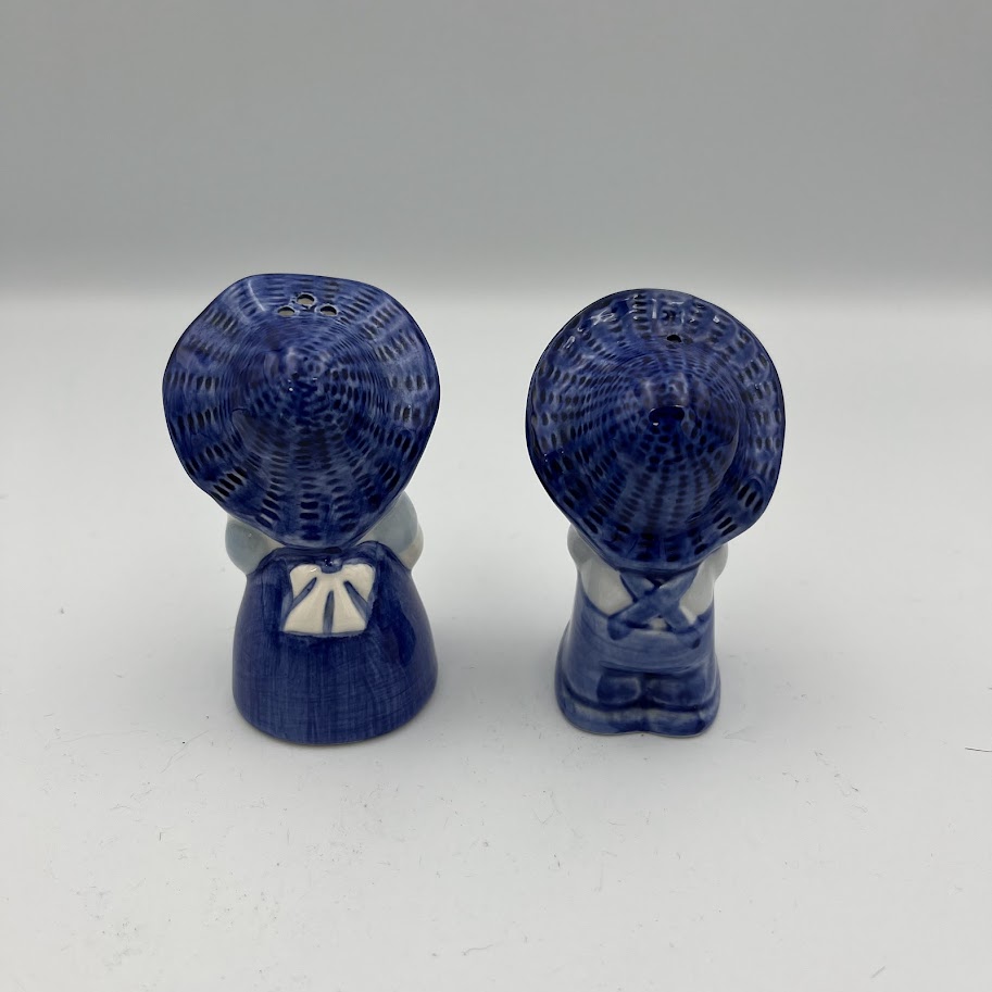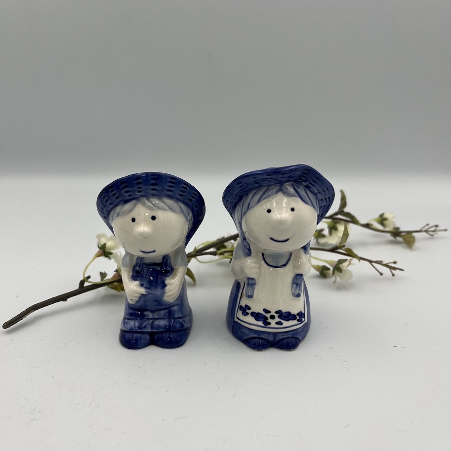 Charmerende salt- og pebersæt i porcelæn udformet som to søde figurer i klassisk blå/hvid stil.
