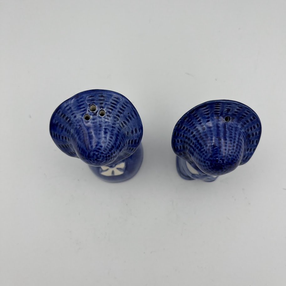 Salt- og pebersæt i blå/hvid porcelæn som figurer – sødt og dekorativt.