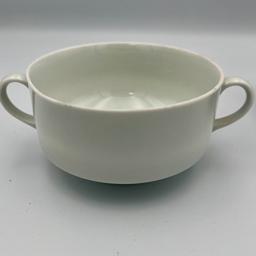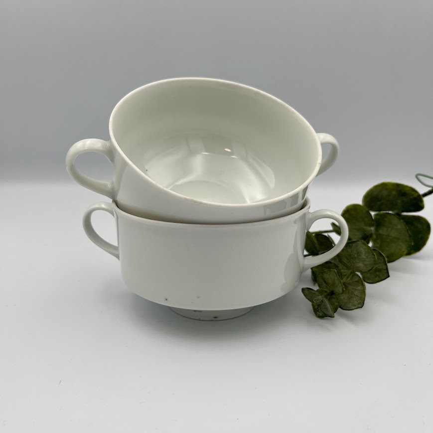 Enkel og klassisk suppeskål i hvid porcelæn med to små hanke.