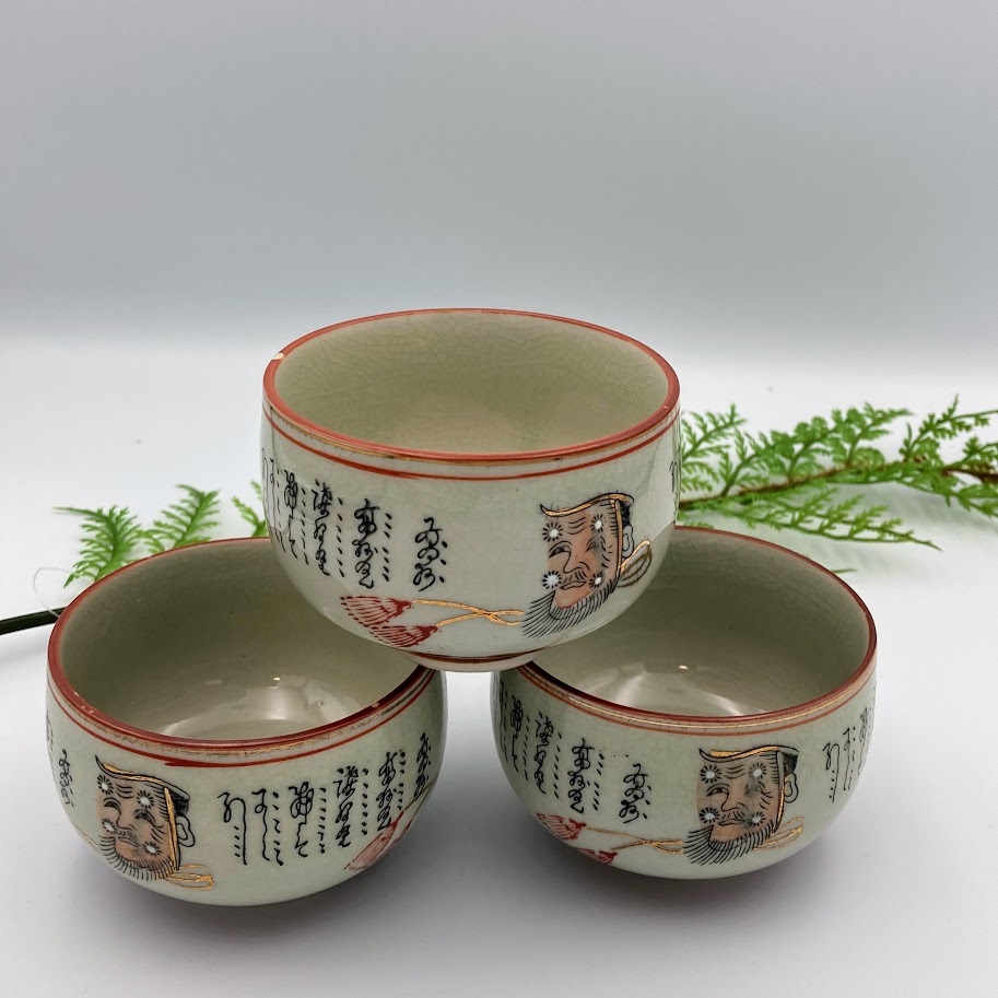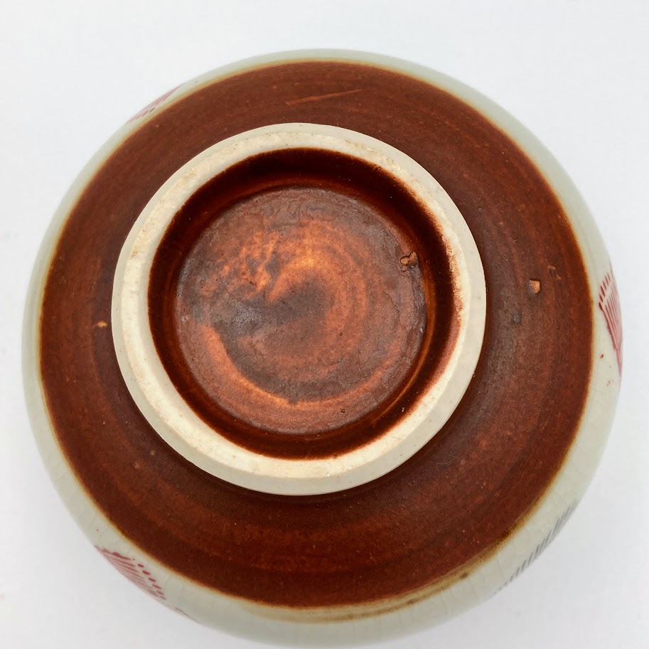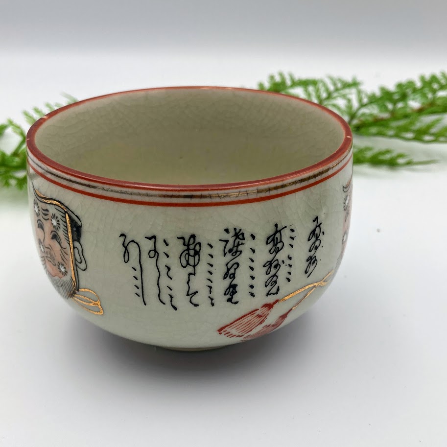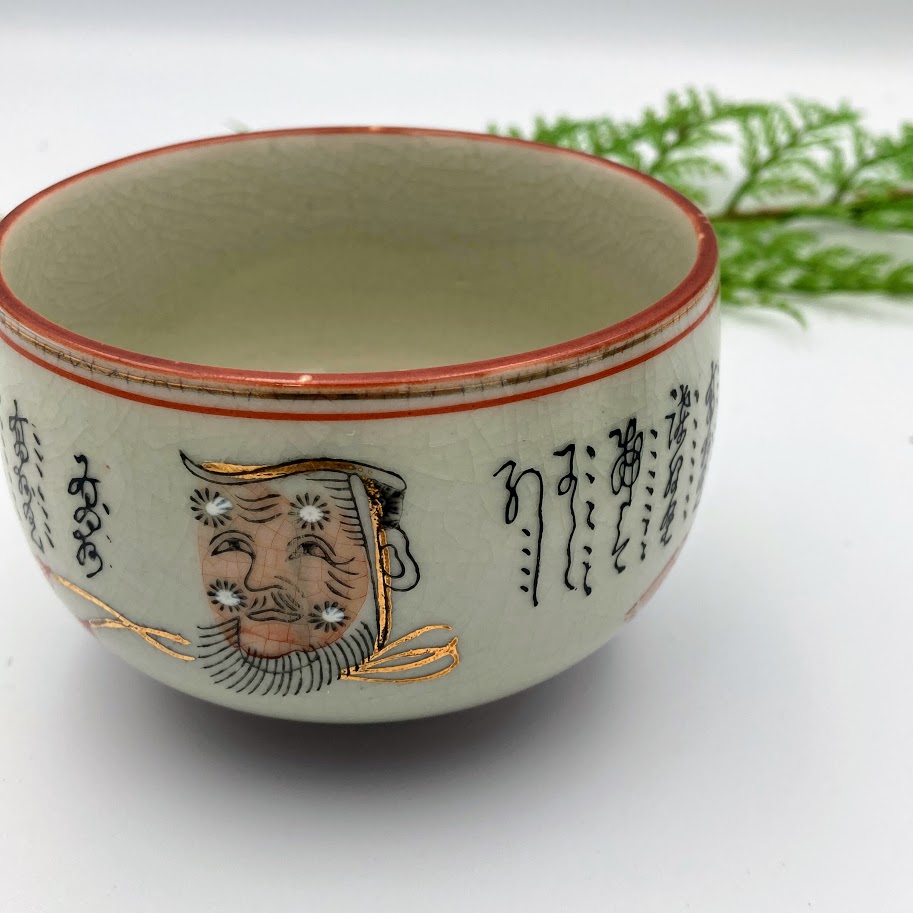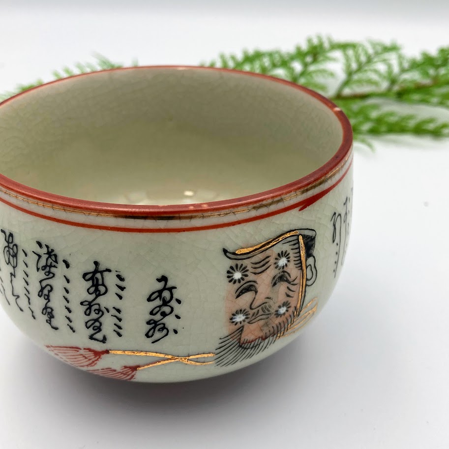Smuk asiatisk keramikskål med dekorativt motiv og kalligrafi. Skålen er udført i lys, krakeleret glasur med rød kant og fine gulddetaljer. På siden ses et ansigt/maskemotiv samt håndmalede tegn. En dekorativ skål, der både kan bruges til servering eller som pynt i boligen.