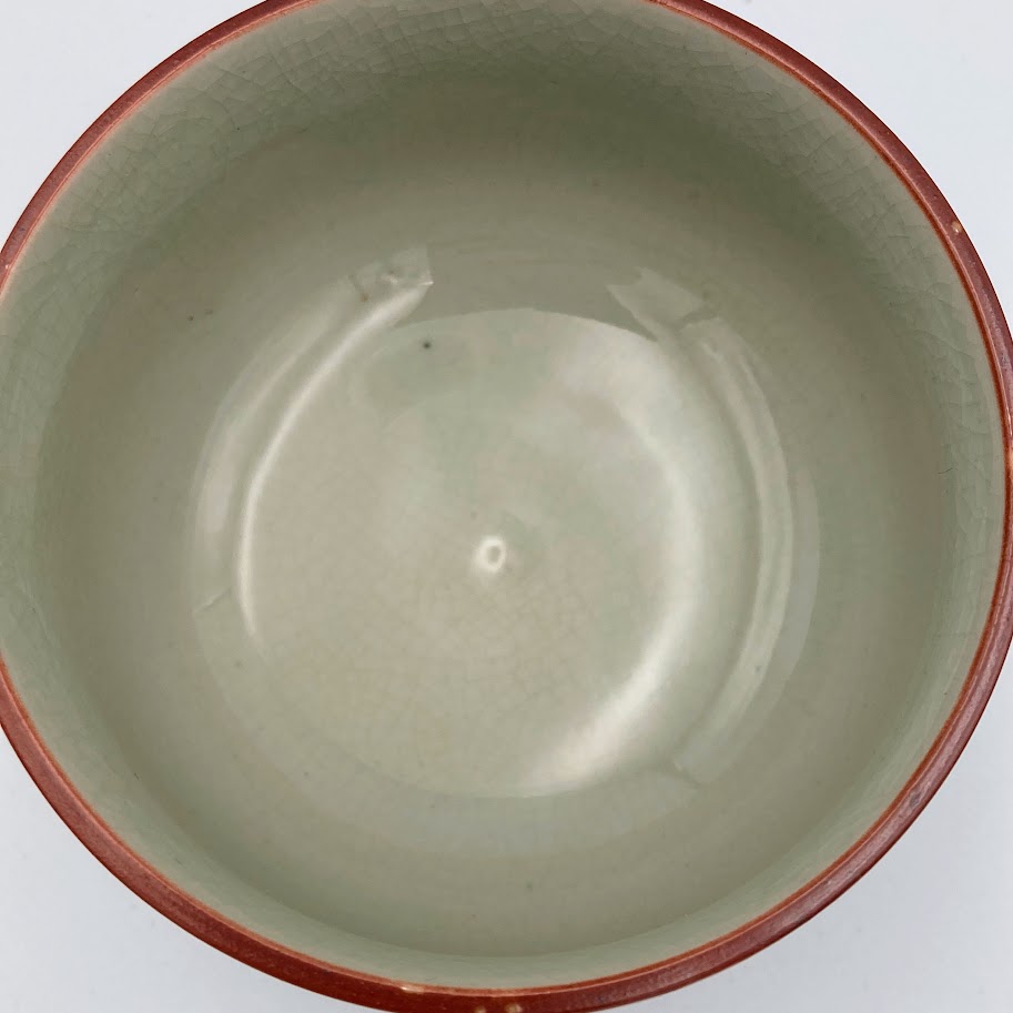 Smuk asiatisk keramikskål med dekorativt motiv og kalligrafi.