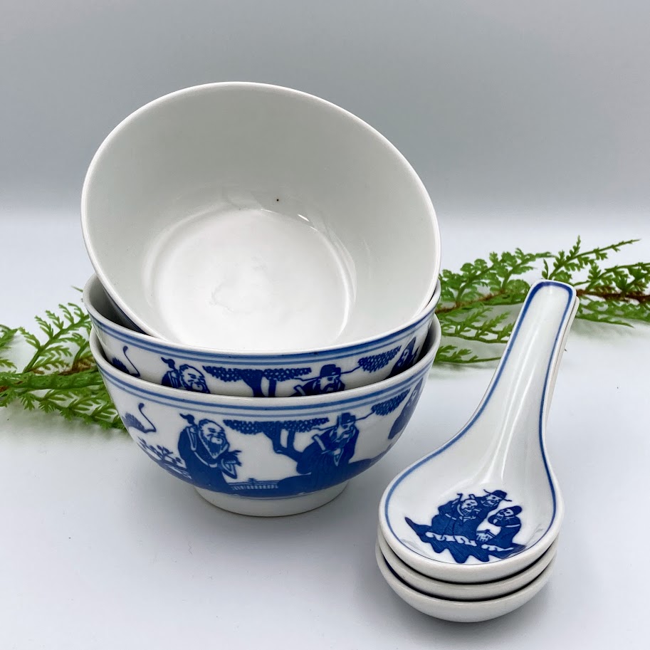 Skålene er dekoreret med klassisk orientalsk inspireret motiv i blå/hvid, og skeerne matcher med samme fine mønster. Velegnet til ris, suppe, snacks eller som en del af en asiatisk borddækning.