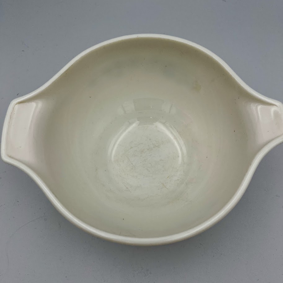Klassisk Pyrex skål i hvidt ildfast glas med fint blomsterdekoration i varme efterårsfarver.