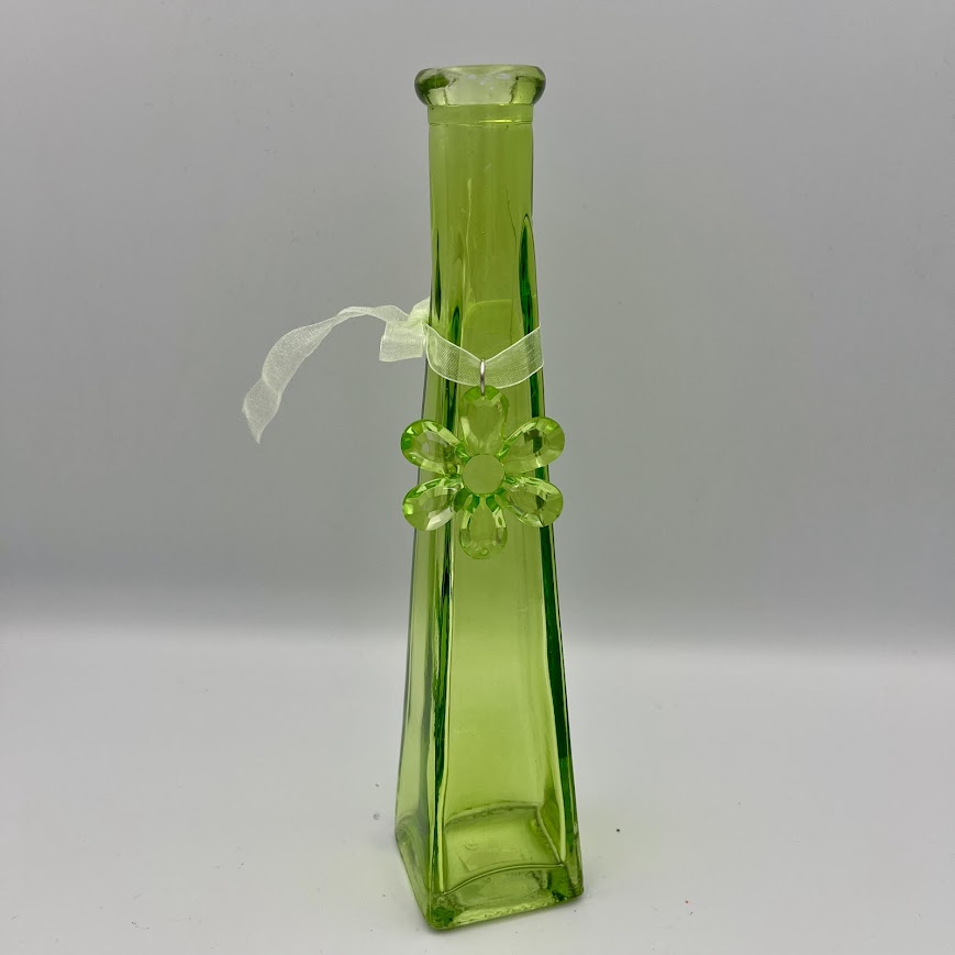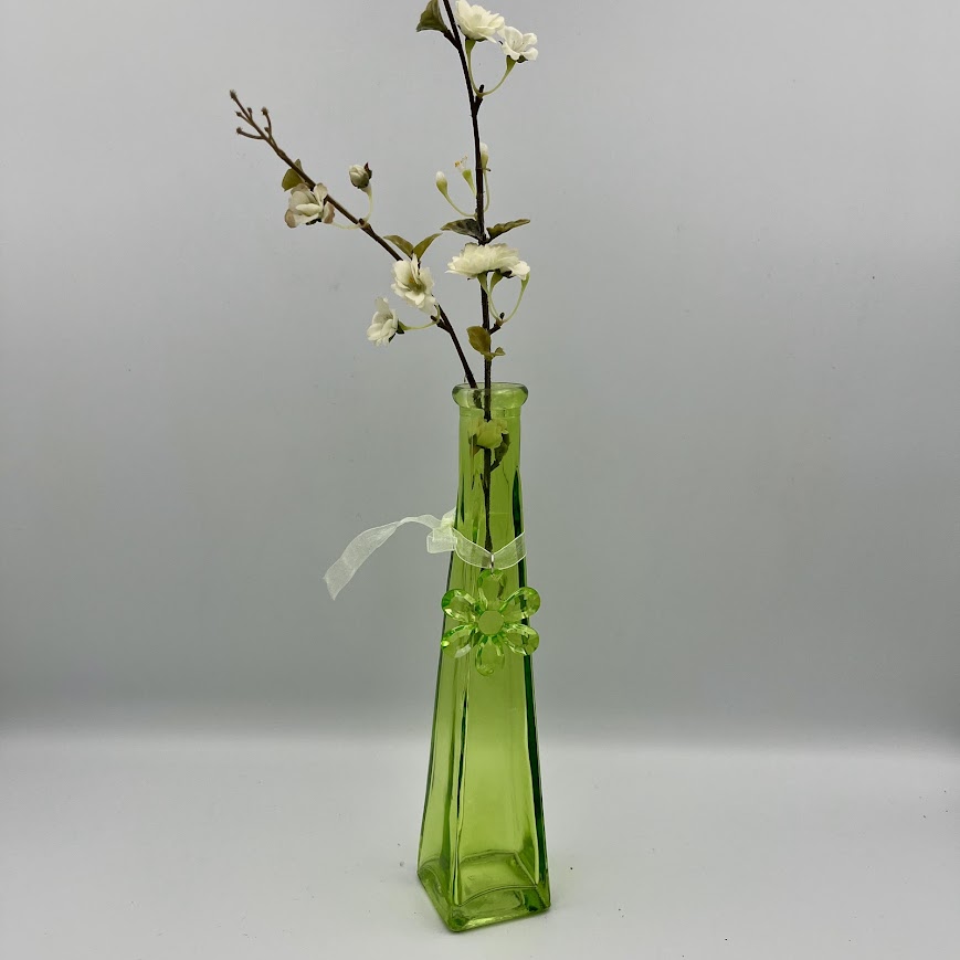 Vasen har en høj, kantet form, som giver et moderne og stilrent look, og er smukt pyntet med en lille blomsterdetalje og bånd omkring halsen.