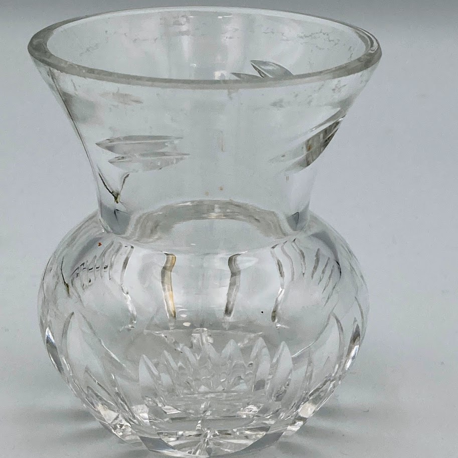 Lille slebet glasvase med rund bund og trompetformet åbning.