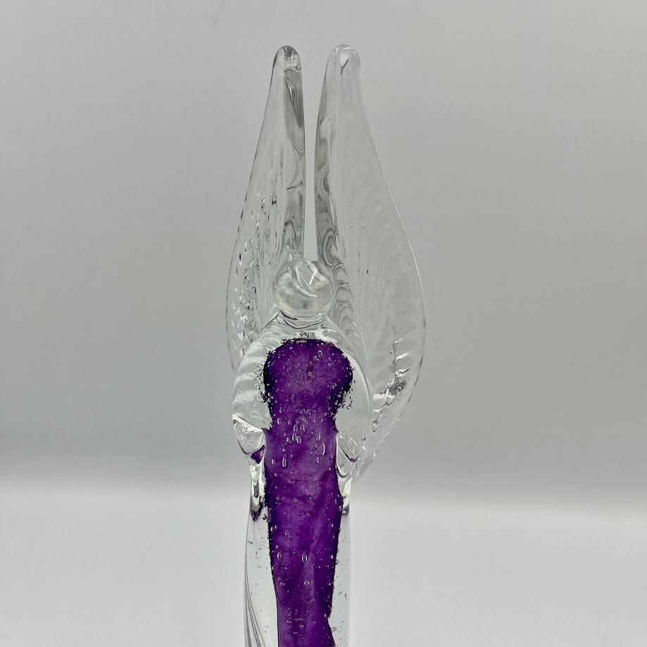 Glasengel med lilla detaljer. Dekorativ figur med et elegant og kunstnerisk udtryk.