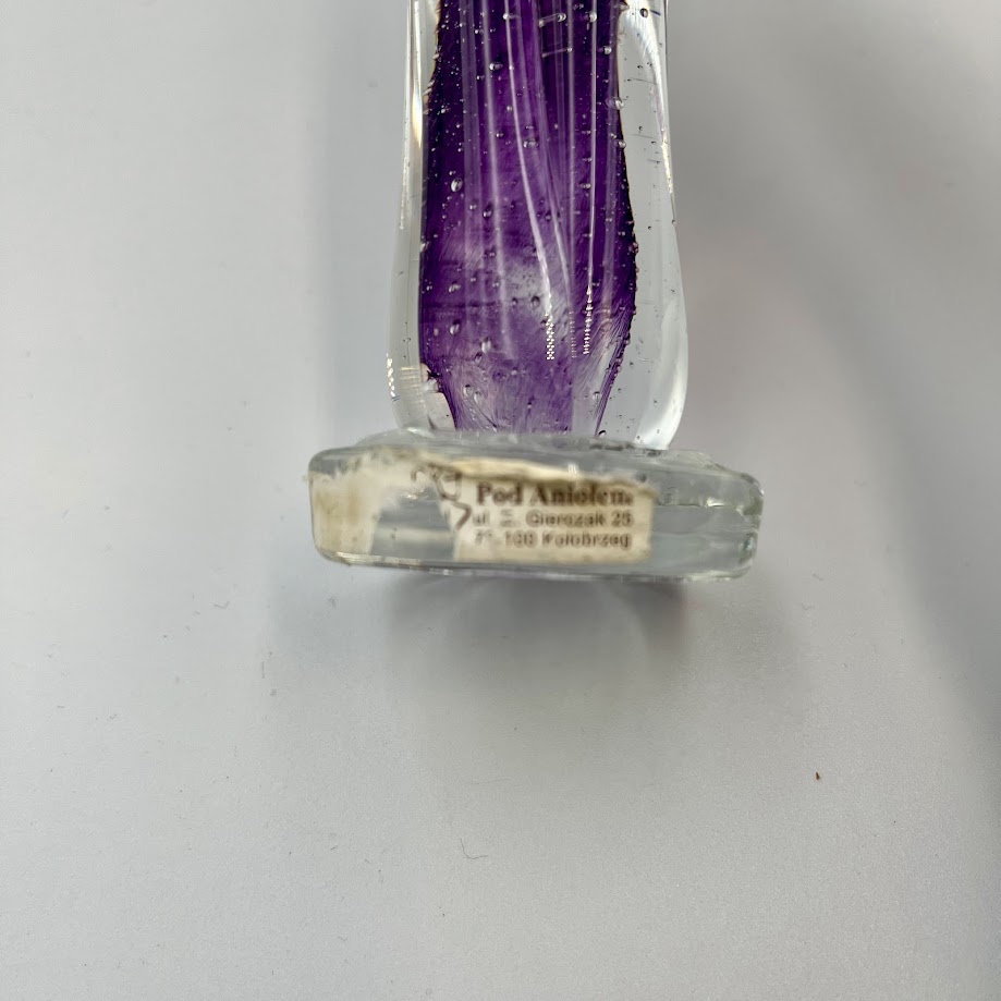 Figuren er udført i klart glas med en flot lilla kerne, som giver et levende farvespil og et unikt look. De fine detaljer og den slanke form gør den både dekorativ og iøjnefaldende.