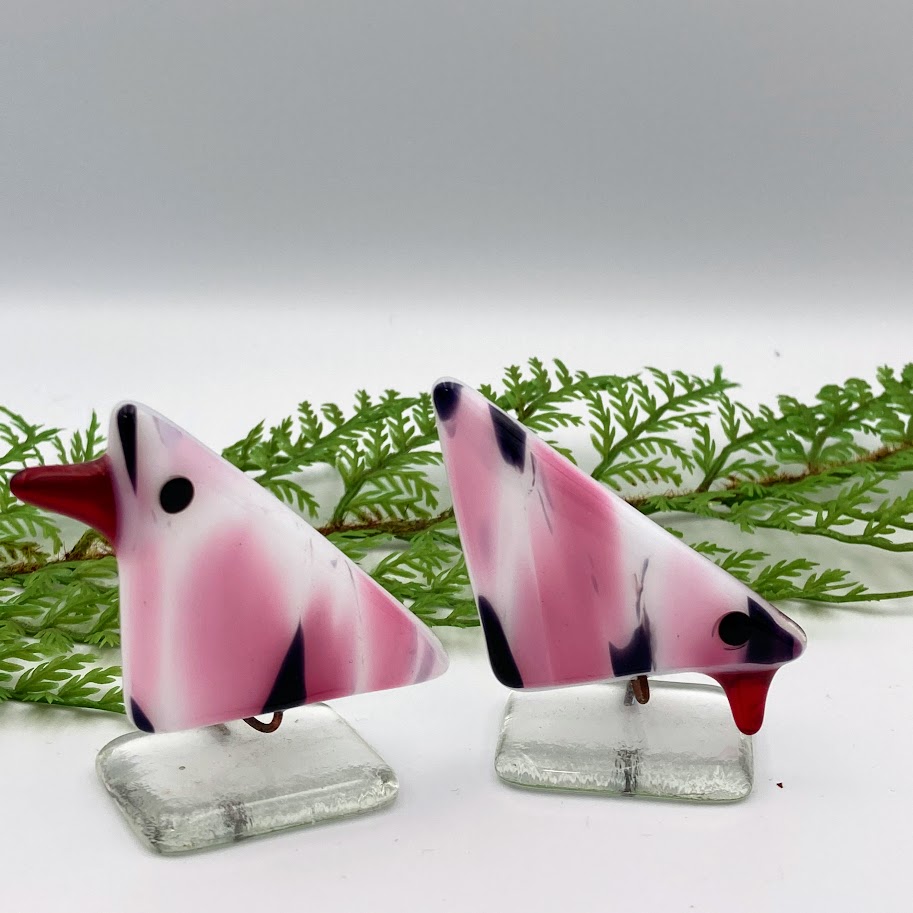 Sæt med 2 dekorative glasfugle i rosa og hvid med mørke detaljer og rødt næb. Står på klar glasfod og passer fint som farverig pynt i hjemmet.