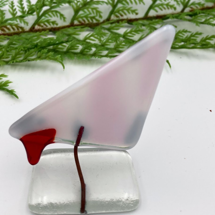 Sæt med 2 dekorative glasfugle i rosa og hvidt glas med mørke detaljer og rødt næb. Fuglene har en enkel, stiliseret form og står på klar glasfod. Et fint og farverigt indslag i indretningen – perfekte som pynt i vindueskarmen eller på en hylde.