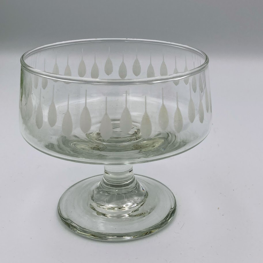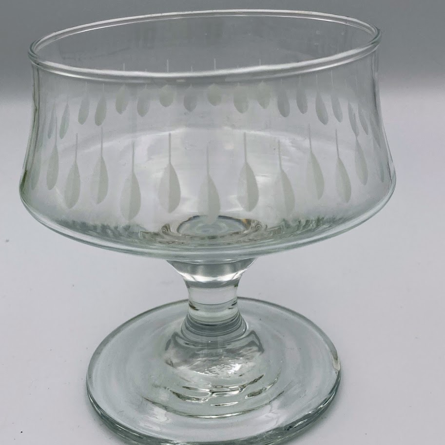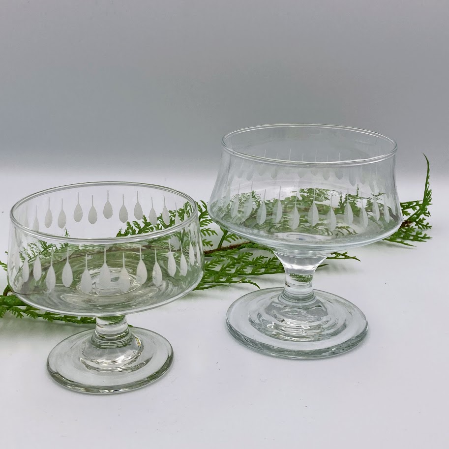Elegante dessert- eller champagneskåle i klart glas med smukt slebet/trykt dråbe/Fjer mønster hele vejen rundt.