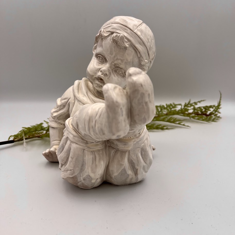 Dekorativ barnefigur i lys keramik med nostalgisk og vintage udtryk.