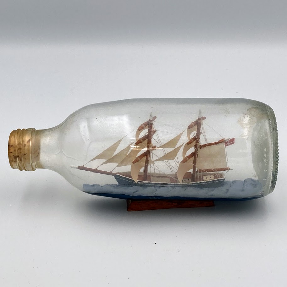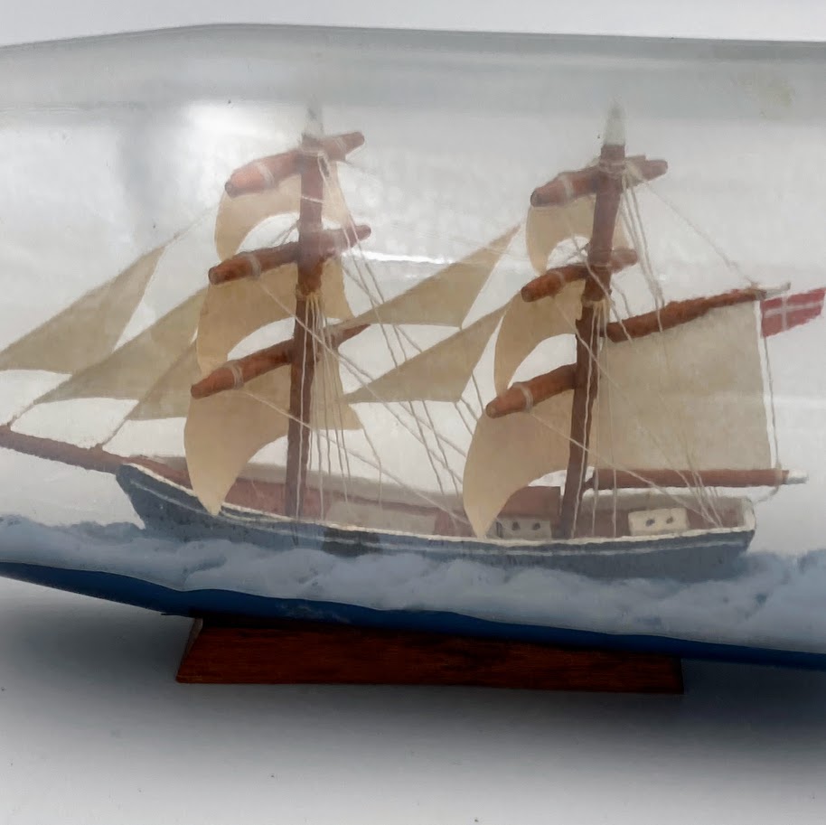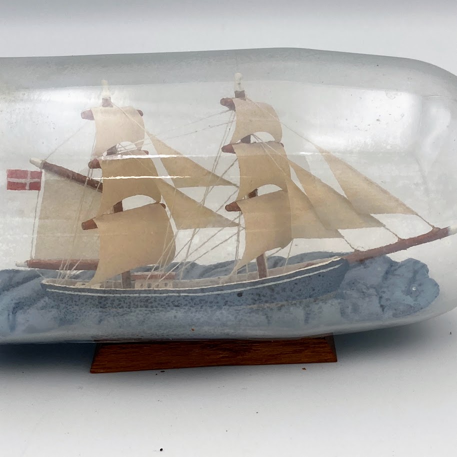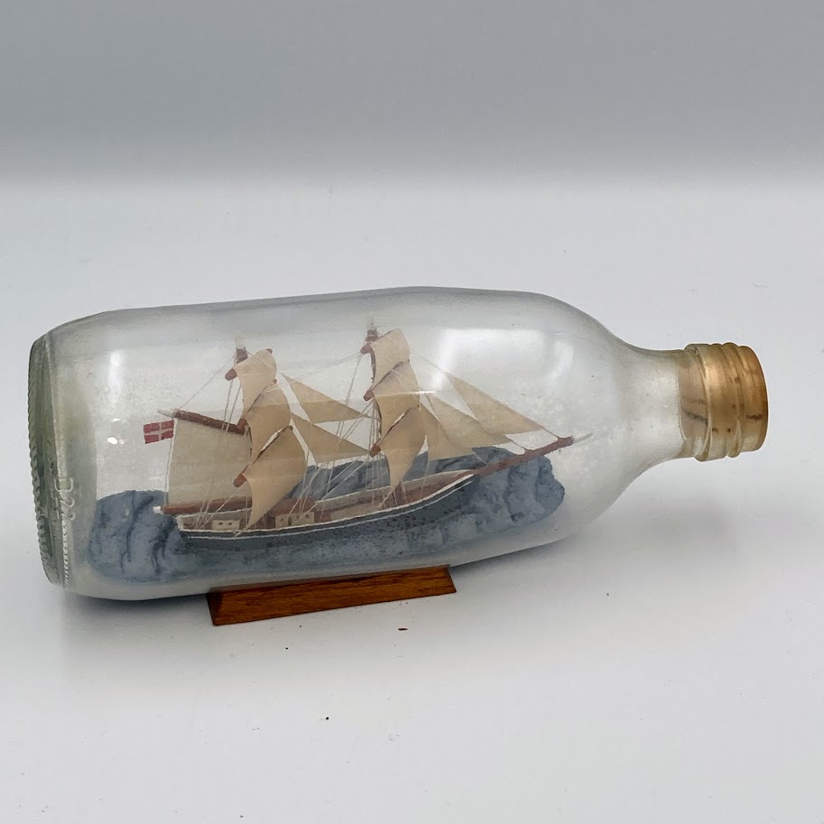 Flot klassisk flaskeskib med detaljeret tremastet sejlskib indlagt i glasflaske. Skibet er udført med fine sejl, rig og små detaljer, og står på en lille træfod. Et dekorativt stykke maritim pynt, som passer godt i sommerhus, på kontor eller i en samling af søfartsgenstande.