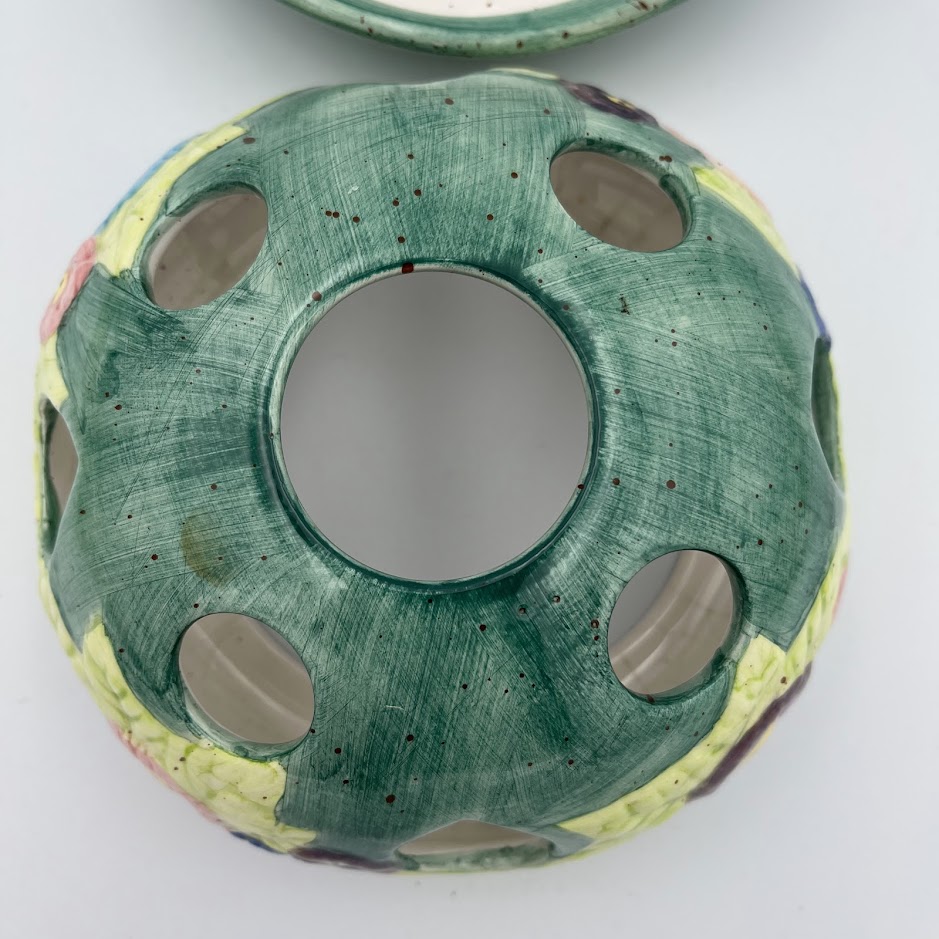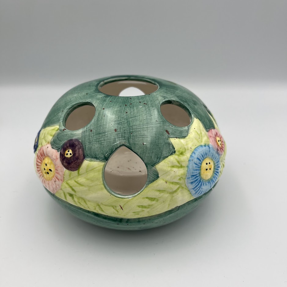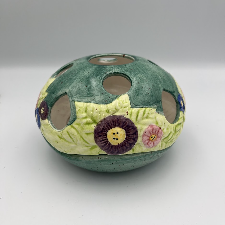 Smuk og dekorativ fyrfadsstage i keramik med farverigt blomstermotiv og udskårne huller, som skaber et hyggeligt lys, når stearinlyset tændes.