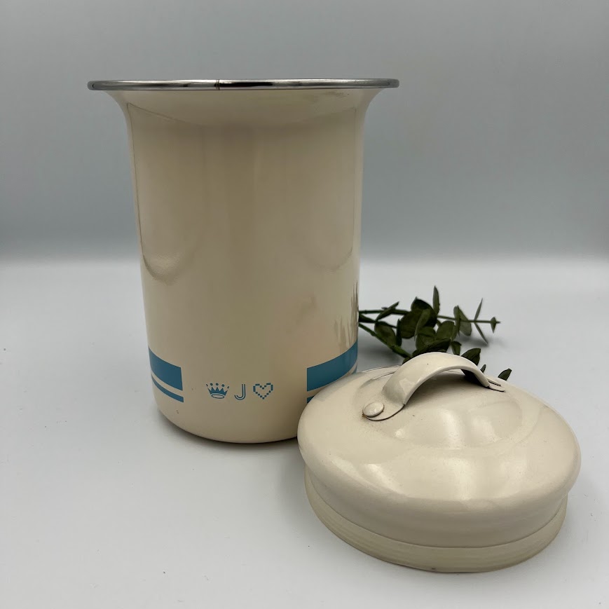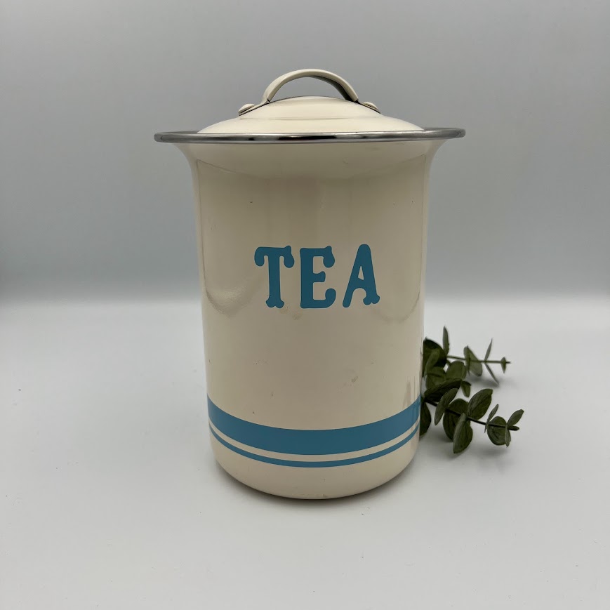 Dåsen har et enkelt og stilrent design i cremefarve med blå detaljer og teksten “TEA” på fronten, som giver et klassisk og hyggeligt køkkenudtryk.