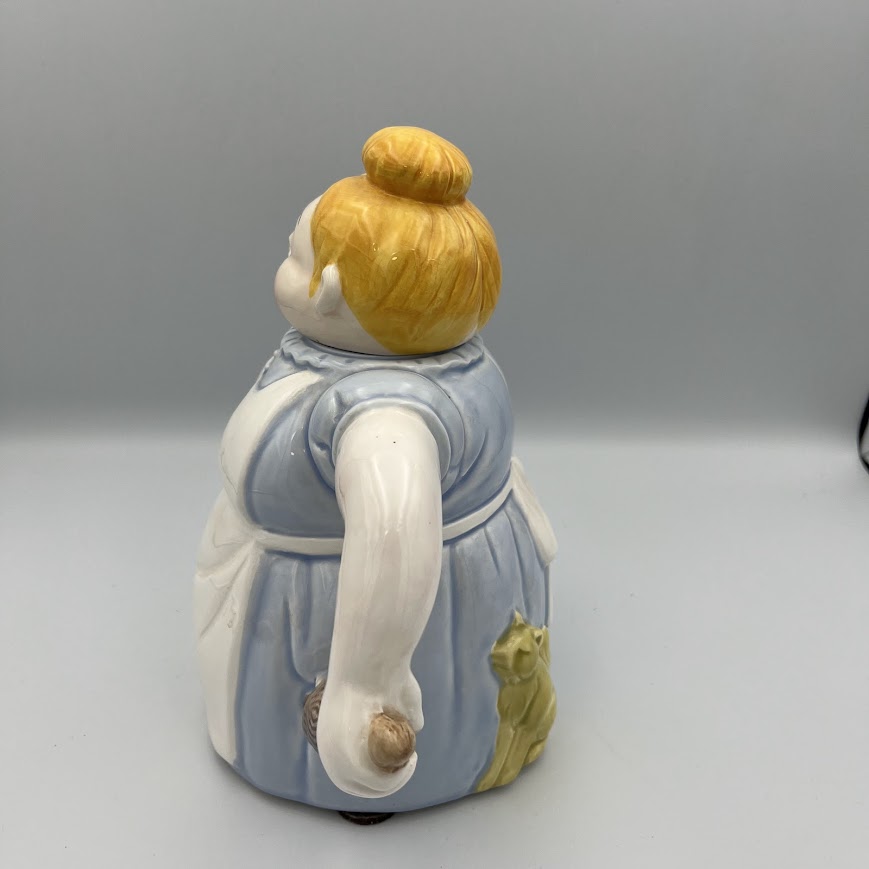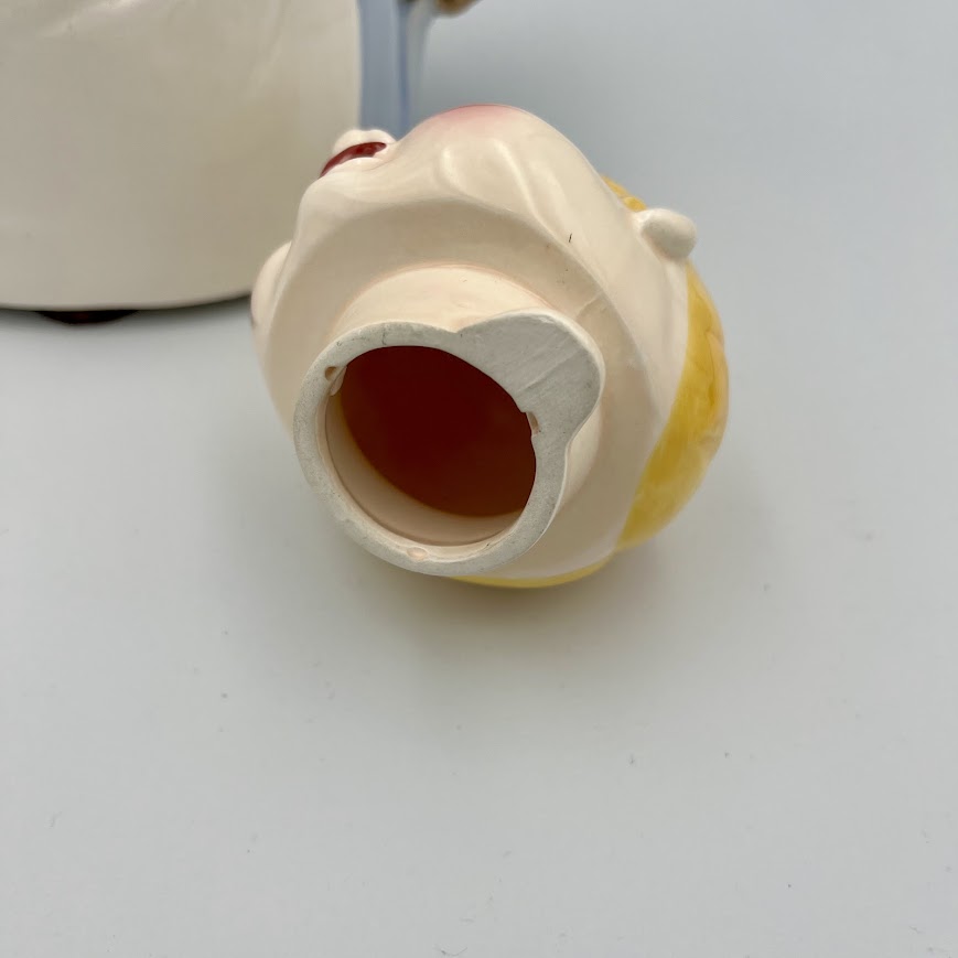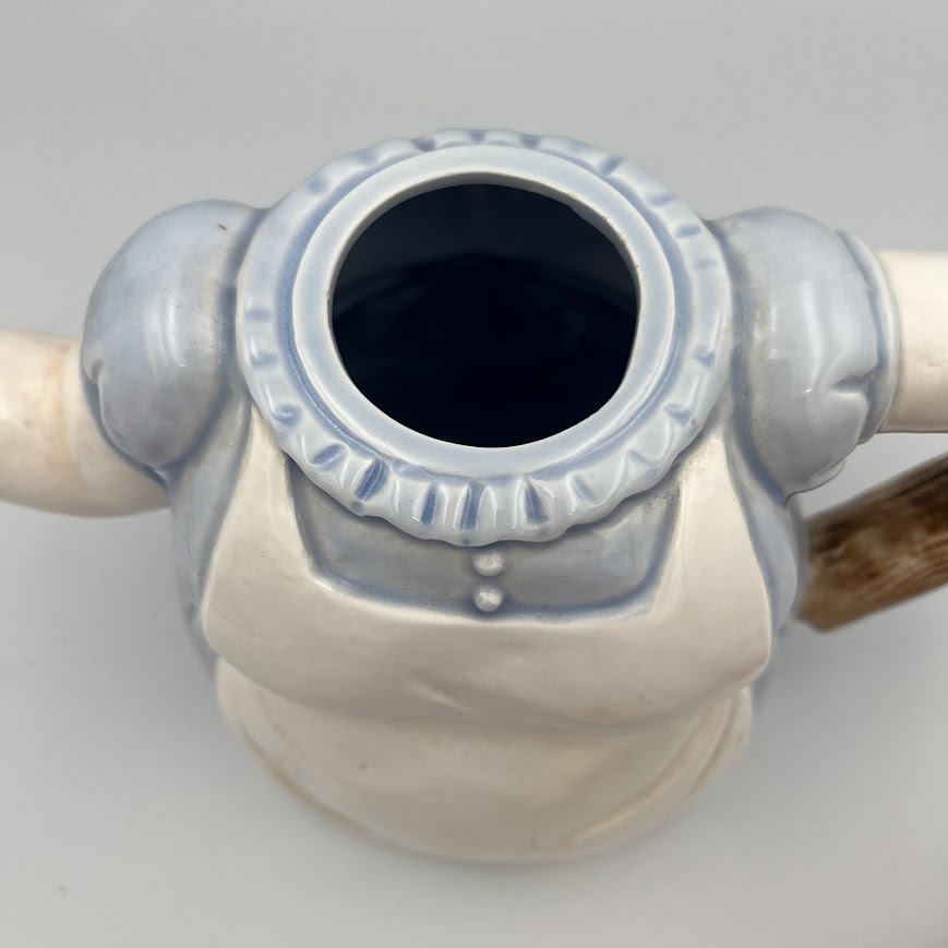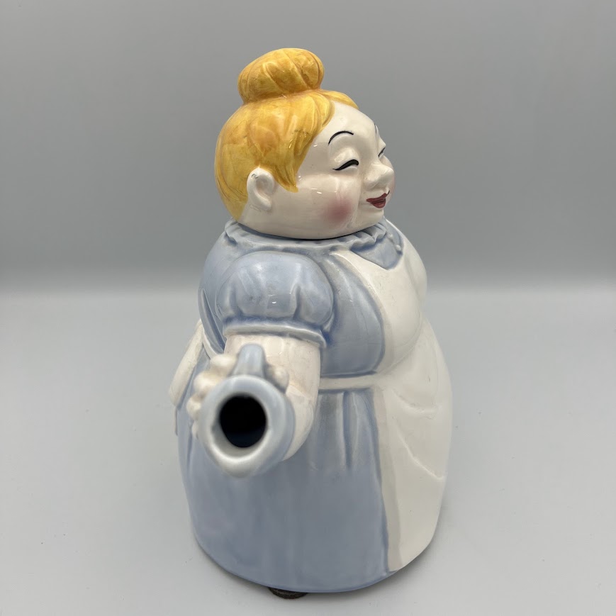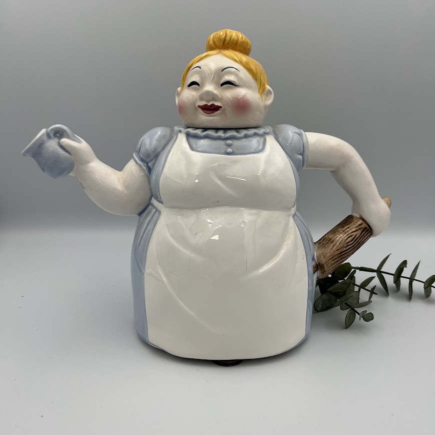 Charmerende og humoristisk tekande i keramik formet som en rund og smilende dame i forklæde.