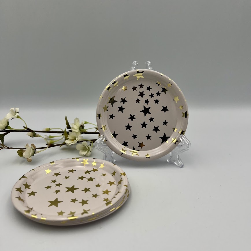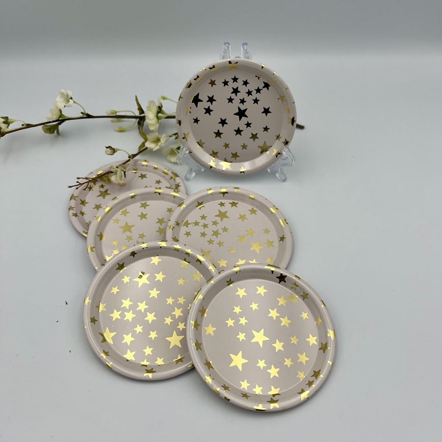 6 ølbrikker med guldfarvede stjerner i elegant design. Perfekte til borddækning, servering og hyggelige stunder.