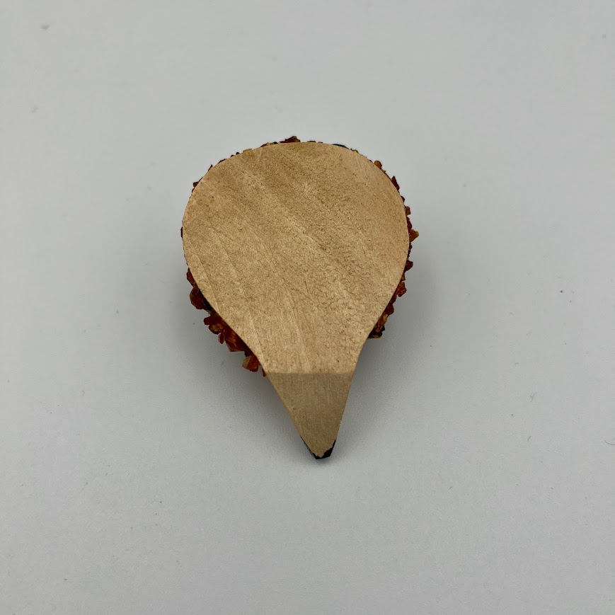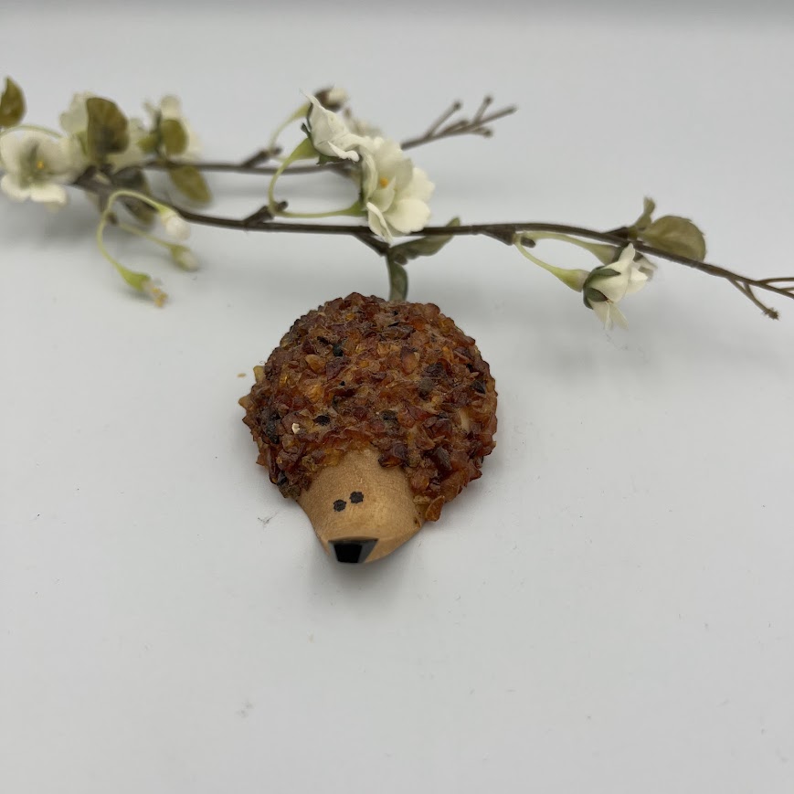 Kroppen er lavet af små naturdele (måske ravstykker) som giver en fin struktur og et livagtigt look, mens hovedet er i træ med håndmalede detaljer.