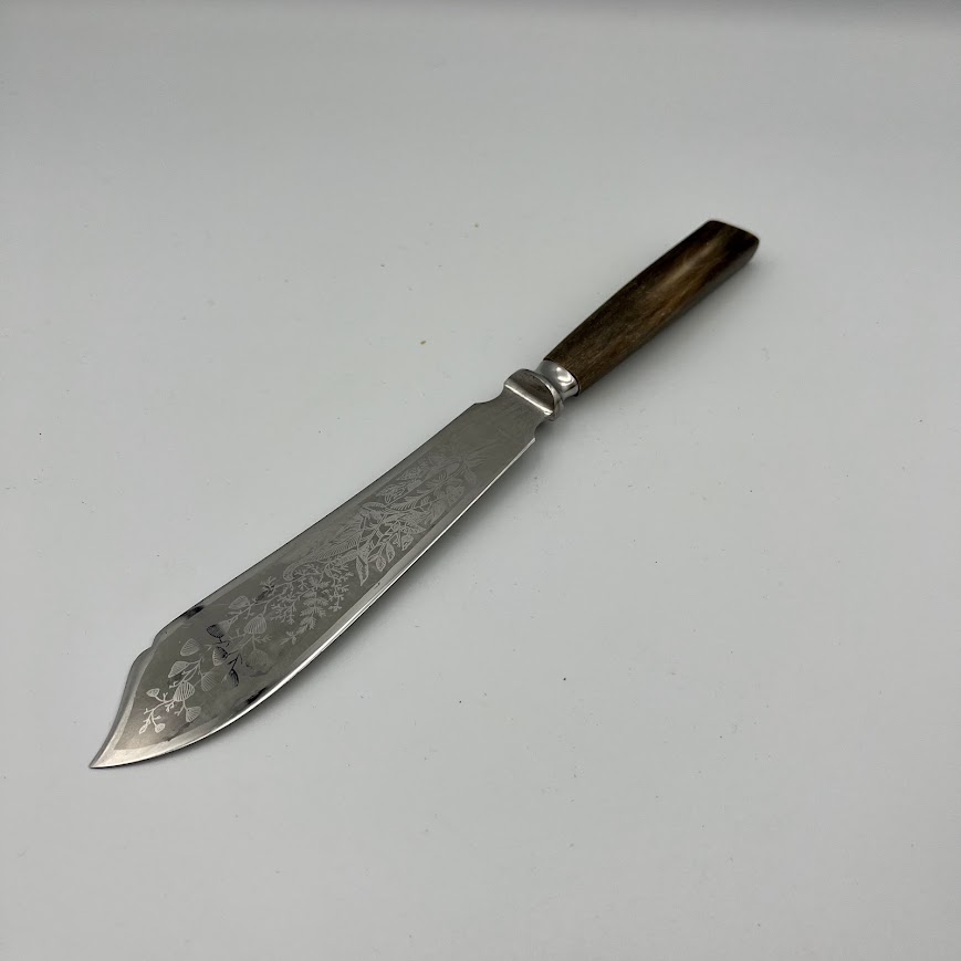 Lagkagekniv / kagekniv med indgraveret klinge og skaft af ben. Perfekt til kage og servering med et elegant udtryk.