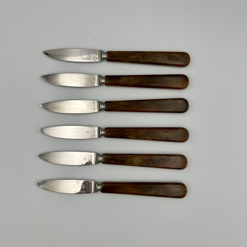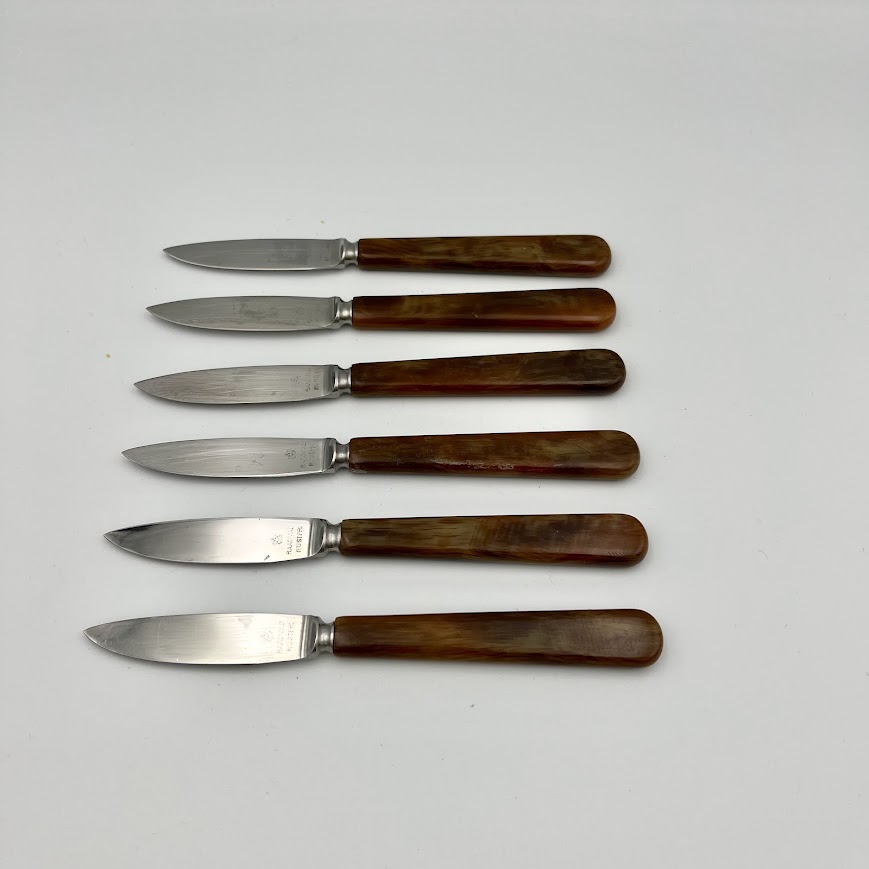 Vintage frugtknive med skaft i flot brun farve (det er ikke træ). Med brugsspor – elegante og klassiske.