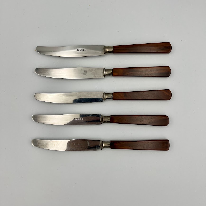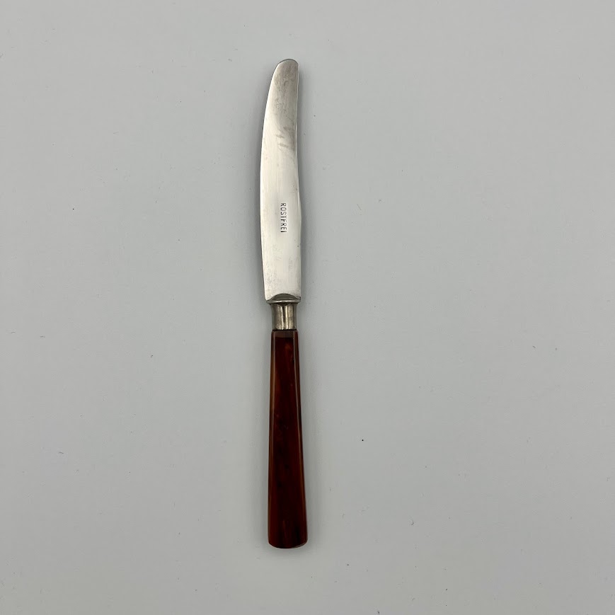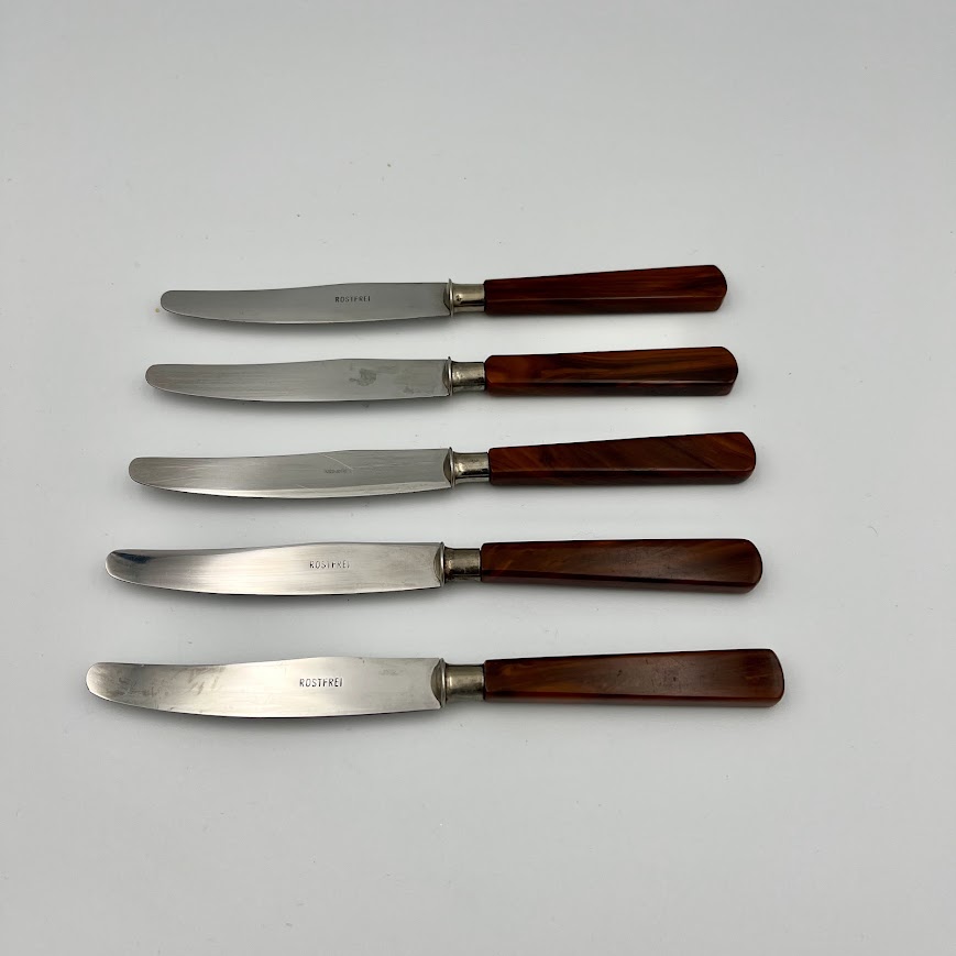 Retro bordknive med skaft i flot brunmeleret plast (bakelit-look) og klinger i rustfrit stål.