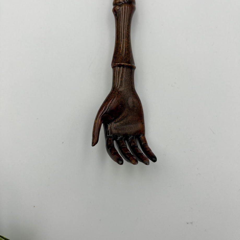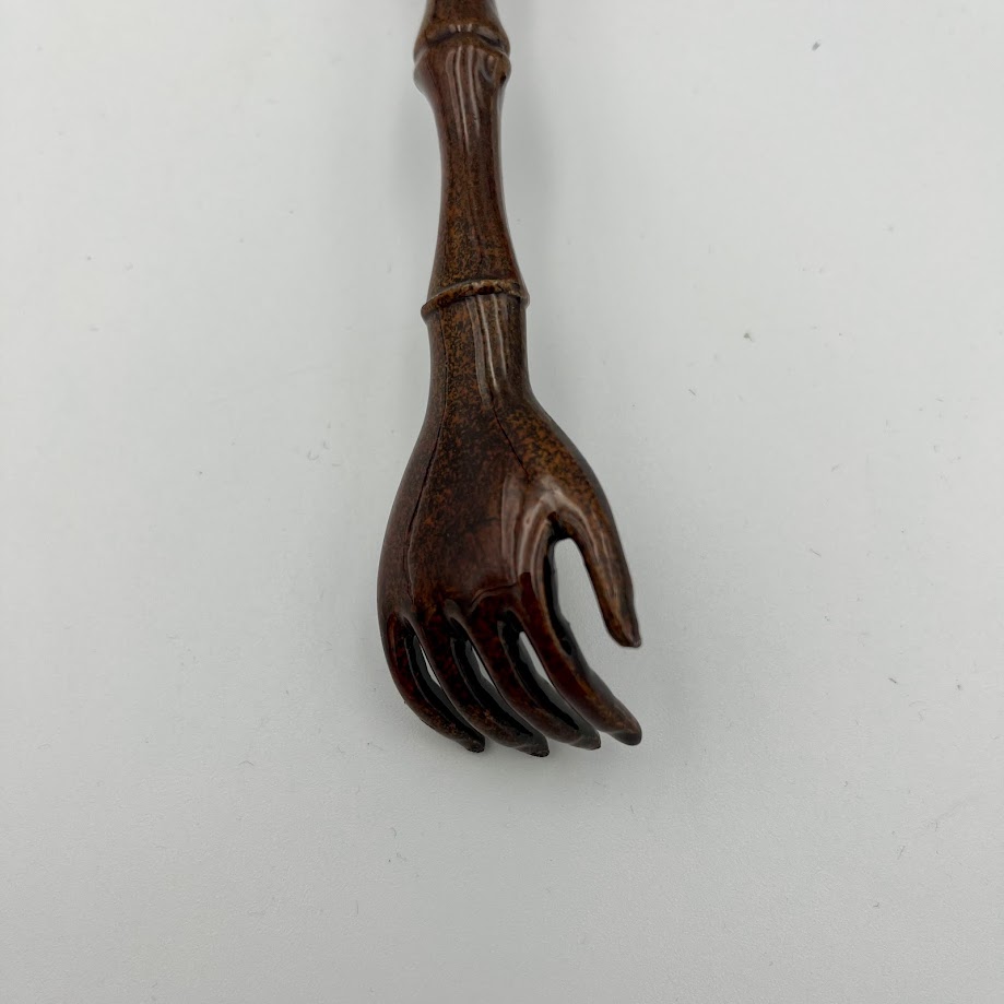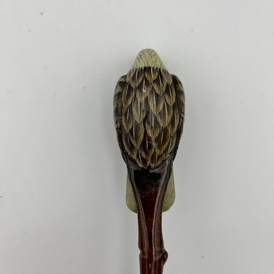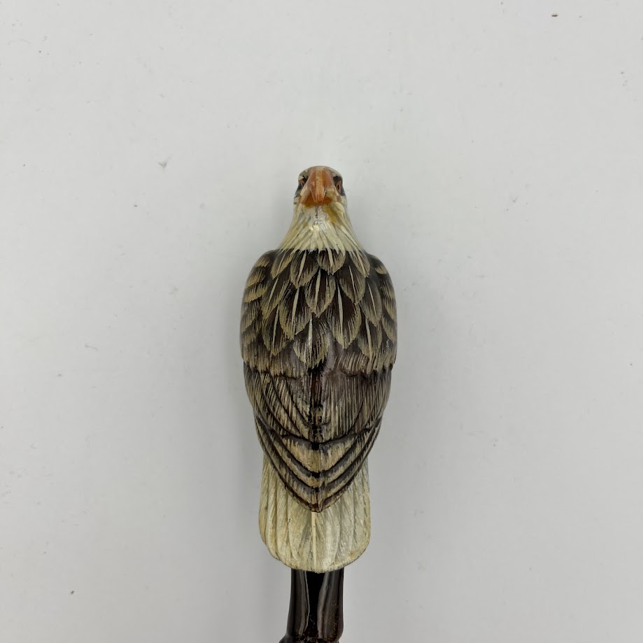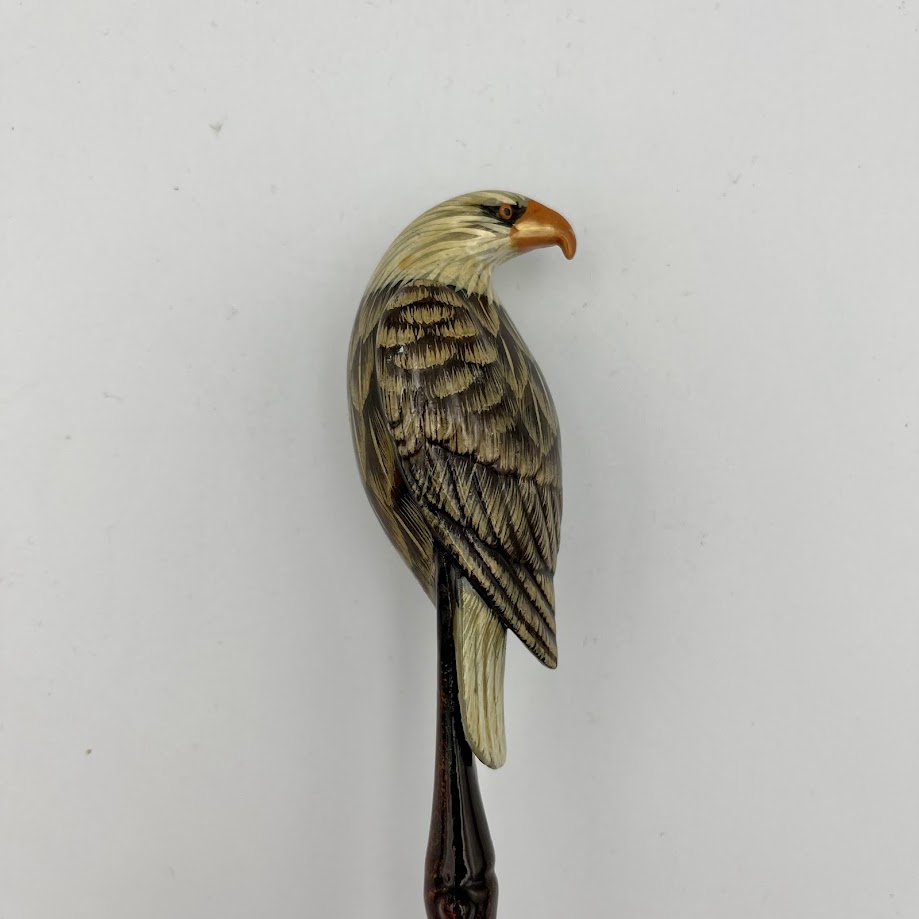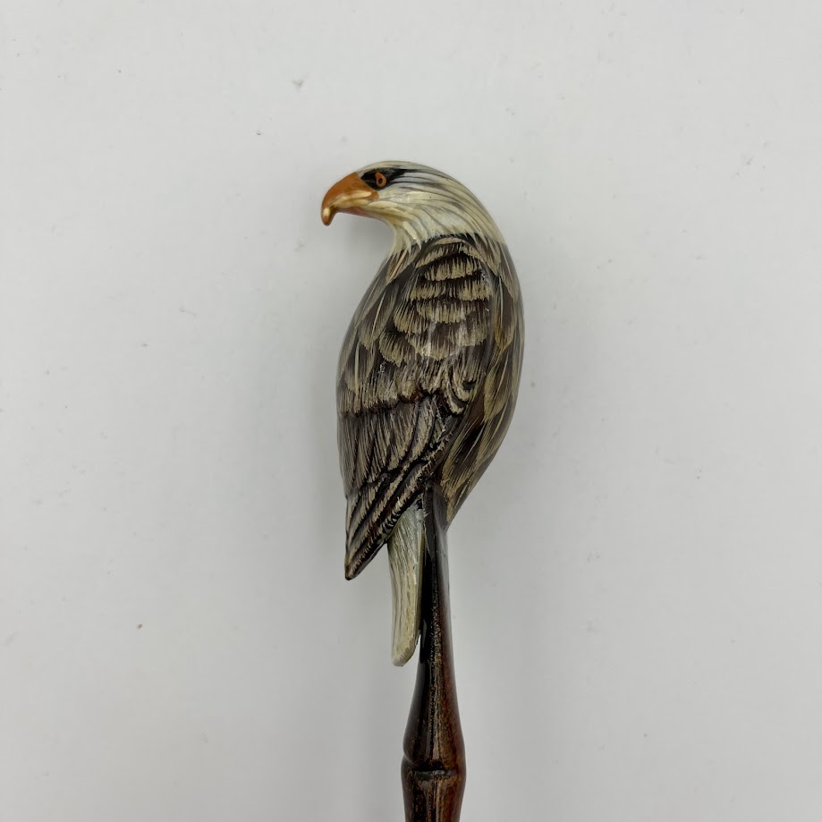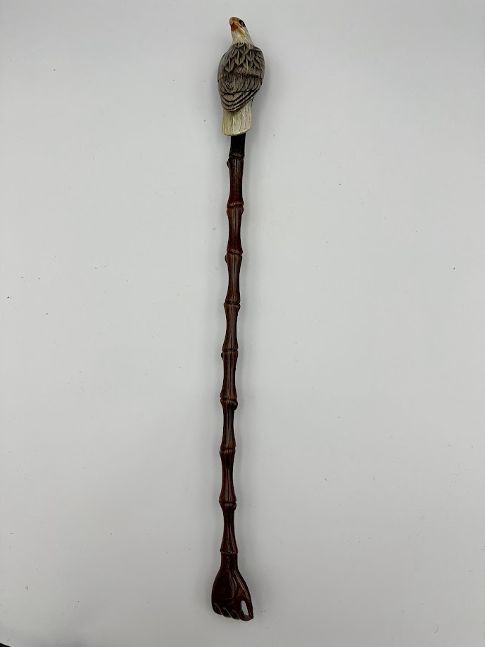Dekorativ kløpind med flot udskåret håndtag formet som en fugl – en ørn – øverst. Skaftet har et bambusinspireret udtryk i mørkt træ, som giver et elegant og eksotisk look.