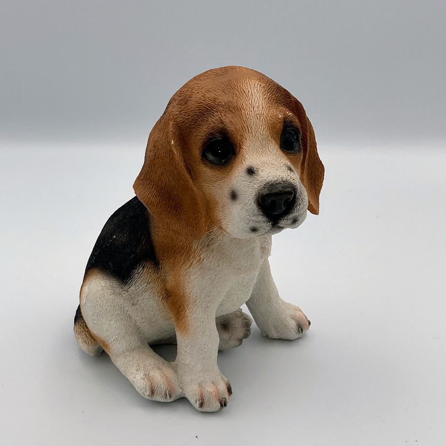 Figur af en beagle hvalp lavet i polyresin. Den har fine detaljer og et sødt udtryk.